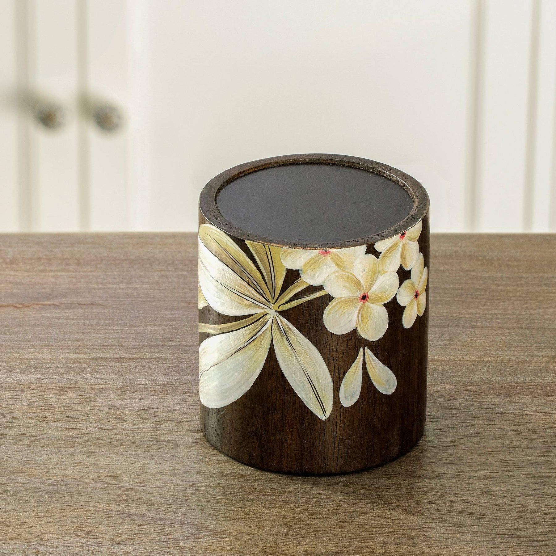 Handcrafted wooden candleholder adorned with intricate hand-painted floral motifs, radiating elegance and natural charm for any space.