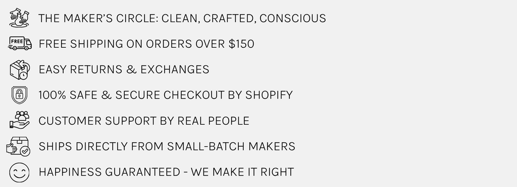 The Maker’s Circle represents the heart of what we believe in. We are in the process of reviewing and vetting every maker and product for alignment with our guiding values. When you see The Maker’s Circle symbol, it means the maker affirms their commitment to these principles in their own work and process.