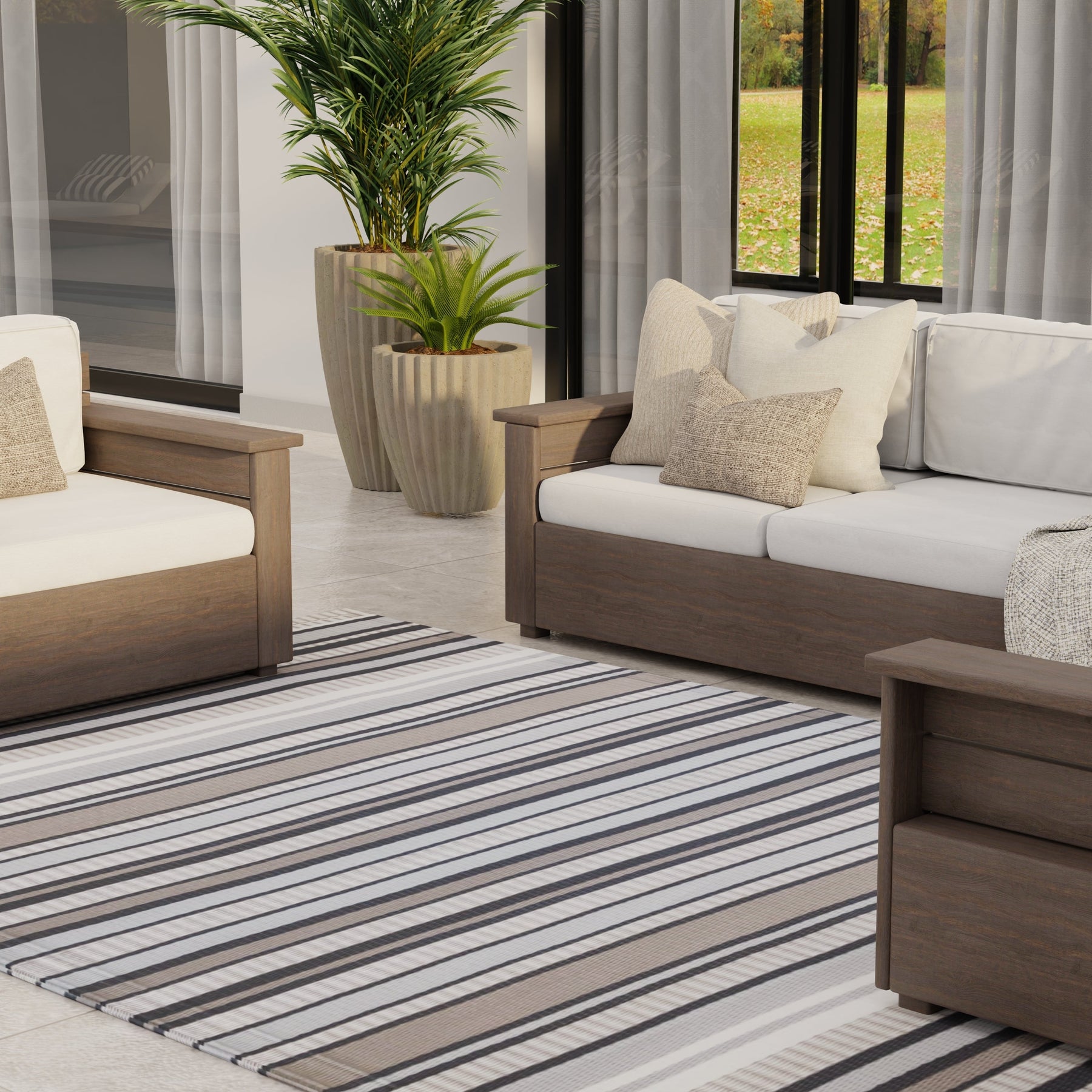 Whether your decor is in warm tones, cool tones, bold or subtle tones, there is a Stripes rug perfect for you. The simple designs and sophisticated colors make these recycled plastic floor covering ideal for any space, indoor or out. Easy to care for and with a one-year color guarantee, this is the rug for you!