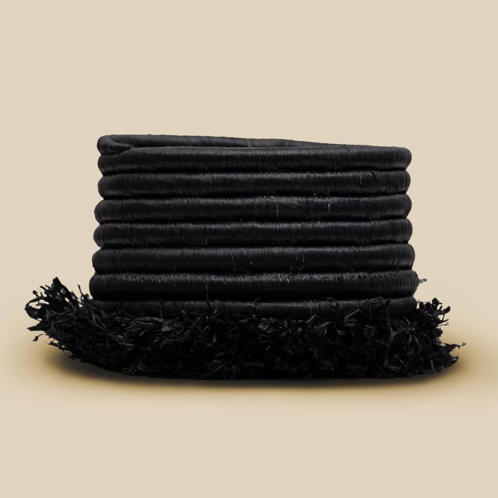 The Up & Down Vessels are a playful set of 2 trinket baskets perfect to store small items, or add fun accents to any decor. Featuring Raffia fringe detail on the rim and base of this duo. Each: 7" L x 3.75" H Hand-dyed in black Features exposed raffia fringe detailing This playful and elevated piece makes the ideal housewarming gift, and is perfect to store and hideaway all of your miscellaneous items in the home and office!