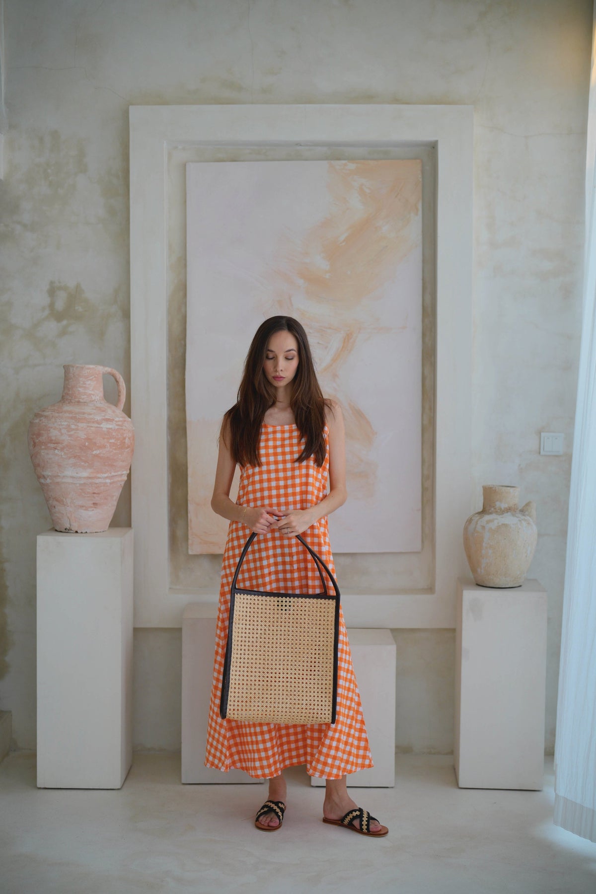 This simple and sleek, oversize and spacious rattan cane and leather trim tote with a unique shape is perfect for those on-the-go who want to carry in chic style. Continue our slow-made and made by demand approach. Each bag is handmade with love by our skilled artisans with fine-quality leather and rattan. Plastic free packaging. Approx.: 15.75"H x 13.75"W x 5.5"D, and 8” handle drop. (40cm H x 35cm W x 14 cm D, and 20cm handle drop). Material: Rattan Cane and Leather trim. Handmade in Bali. Shipping & Returns: Return accepted for store credit only. Please see our Shipping & Returns page for more details.