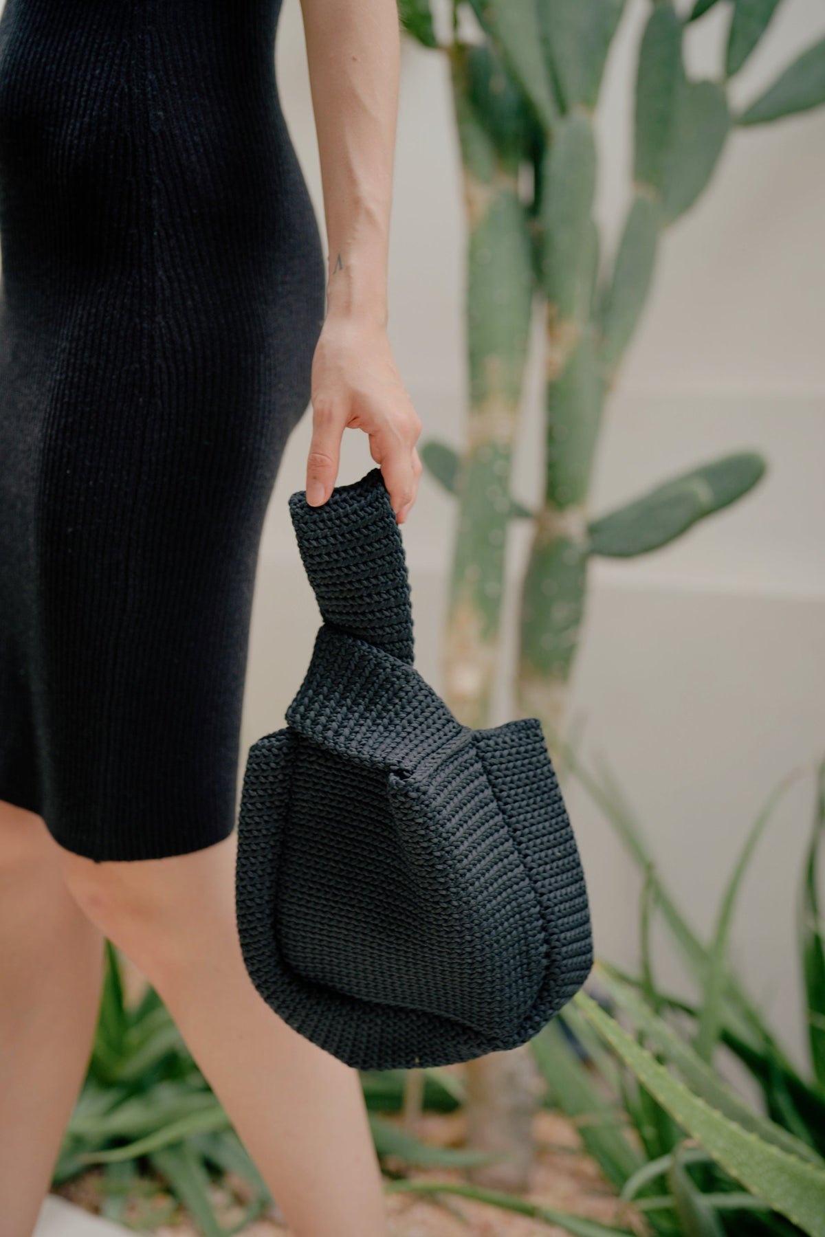 This stand-out clutch featured in a handheld style and stunning knit fabrication with double side handles to carry all your essentials need. Color: Black. Dimension: 7.5"W x 11.5"H x 3.5"D. Handle drop 5.5". 19 cm W x 30 cm H x 8.5 cm D. Handle drop 14 cm. Material: Acrylic yarn. Unlined. Handmade with love. Shipping & Returns: Return accepted for store credit only. Please see our Shipping & Returns page for more details.