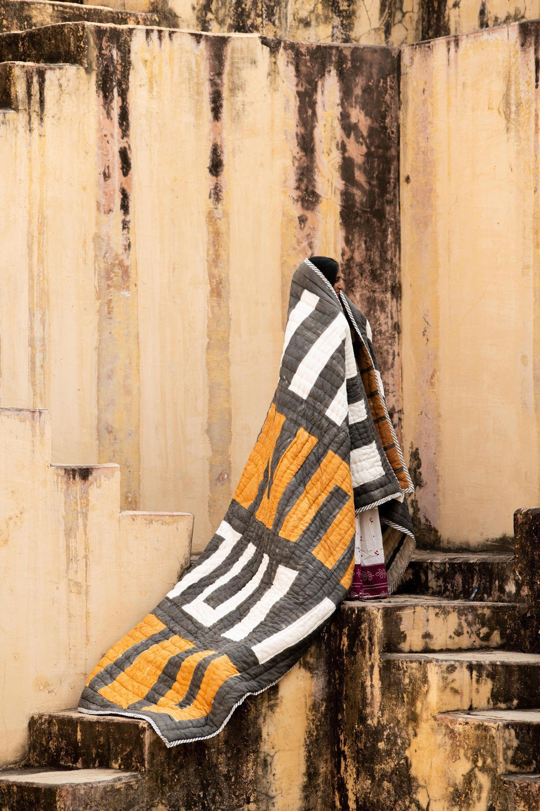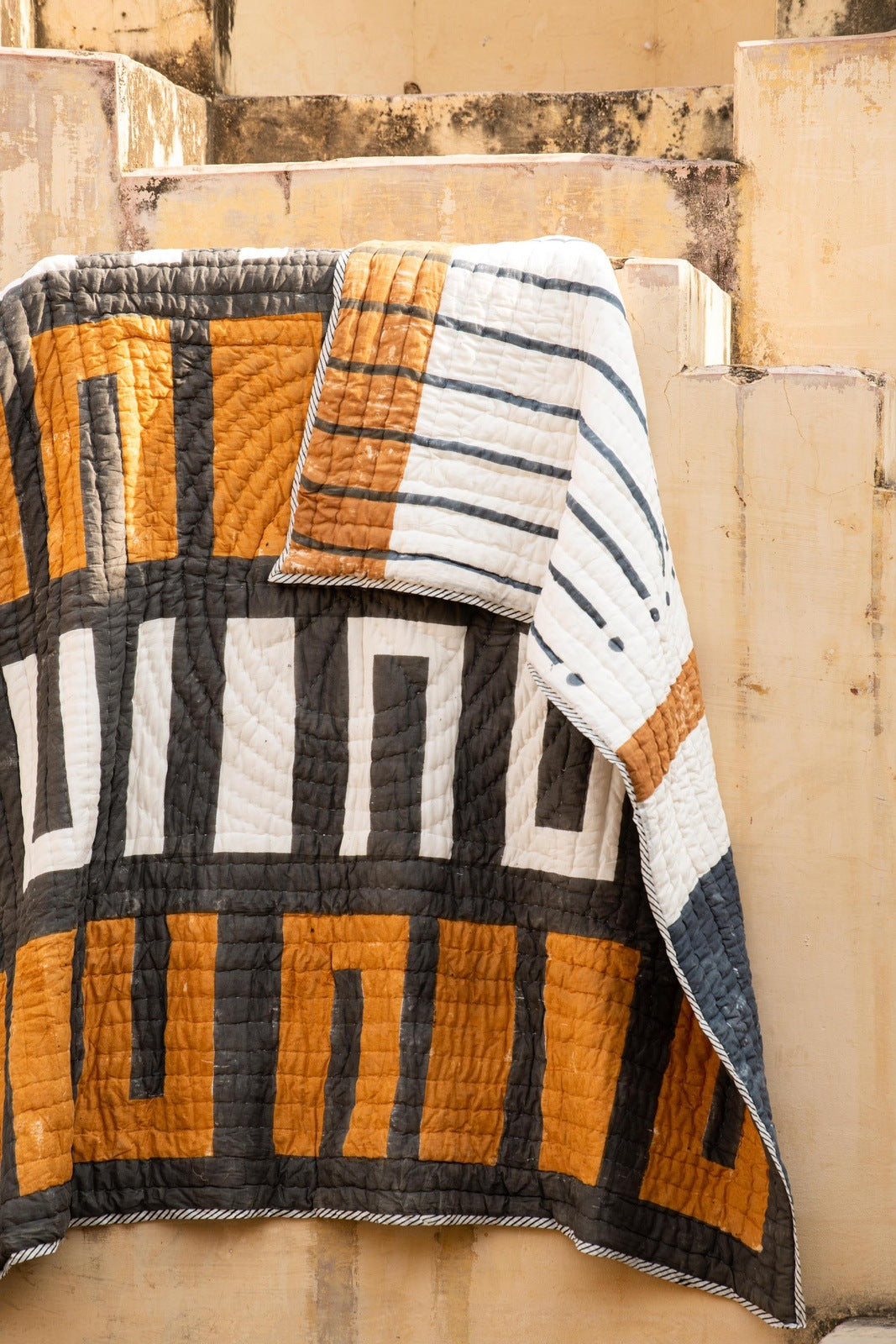 Each quilt is handmade, requiring attention from 4 different artisans, including wood carvers, block printers, quiltmakers, and dye specialists. The design is hand-pressed onto each quilt using hand-carved wooden blocks dipped in dyes. The printed cotton shells are brought to the homes of quiltmakers, who stuff and stitch the quilts by hand, creating the final product. CQC LA's quilts are made in small batches. Due to the handcrafted nature of this item, expect slight variations in the appearance of each unique piece. - 100% cotton voile exterior - 100% cotton stuffing - Made in India - Ships from California - Twin size: 68″ x 86″ - Queen size: 96″ x 96″ - King size: 108″ x 108″