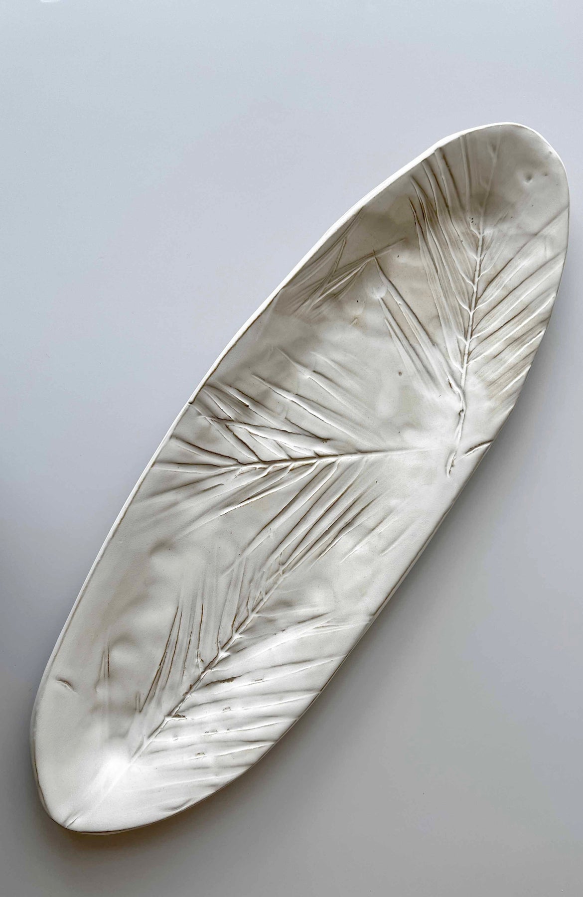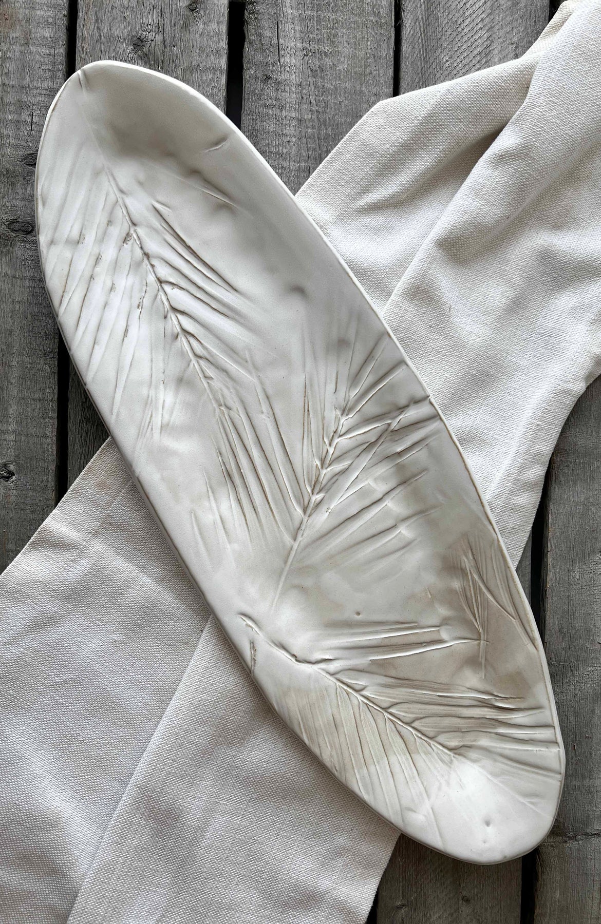 Your home is your sanctuary. Effortlessly transform your home into a tranquil oasis with the Sandalwood Collection. Each handcrafted piece is carefully stamped and glazed for a soothing, meditative experience. Mix and match with the Luna, Borealis, and Palo Santo collections for a truly unique touch to your living space. This tray was hand cut and pressed with a fern leaf. The clay gray stoneware (used in the Palo Santo Collection) with a salt white glaze that gets warmer beige tones due to the texture of each piece. Due to the size of this item I recommend hand washing. Approximate measurements: 17-18 inches long x 6-6.5 inches wide x .75 inches tall *All of my products are made by hand and will vary. Each glaze firing varies as well. Please keep this and my refund policy in mind when you place your order. Thank you.