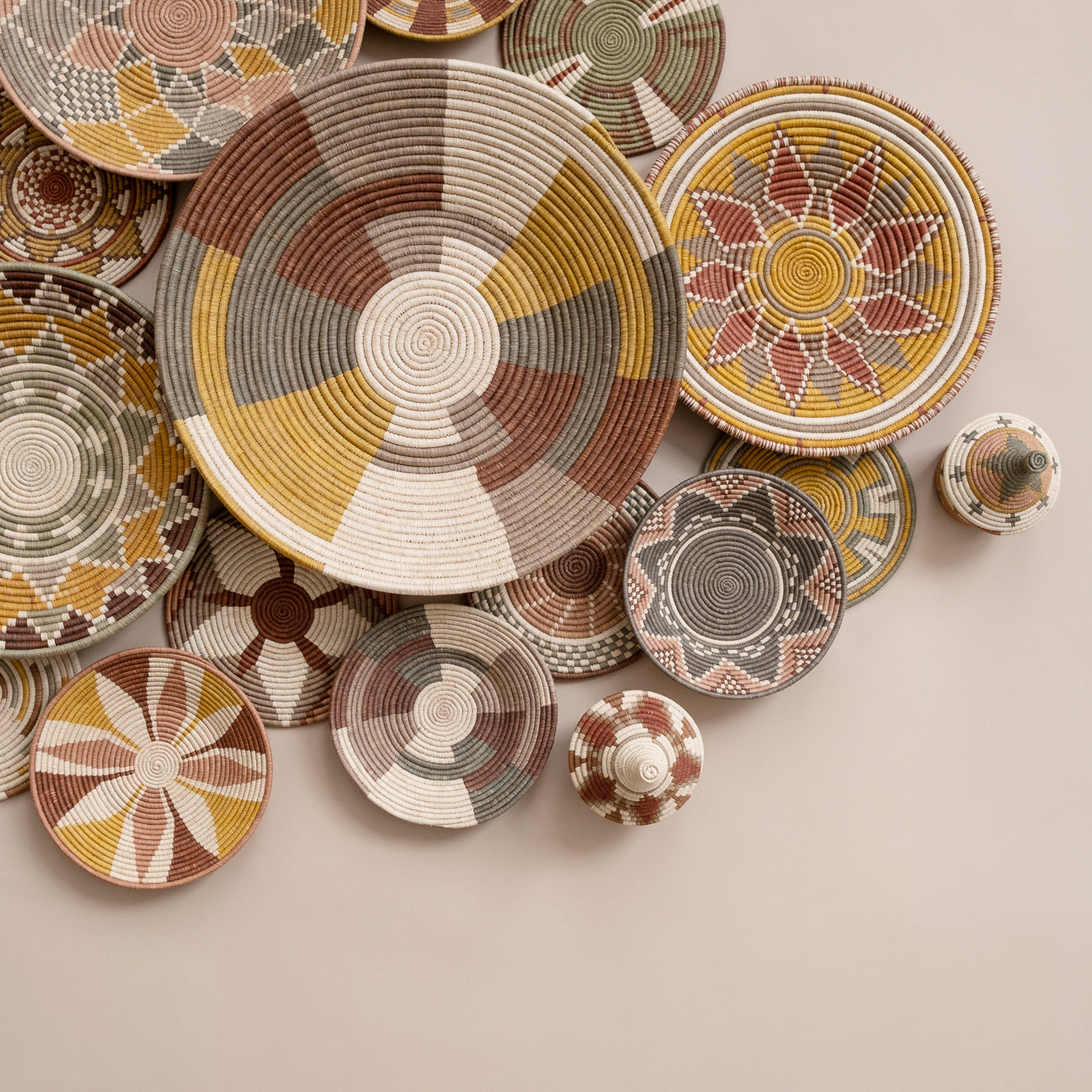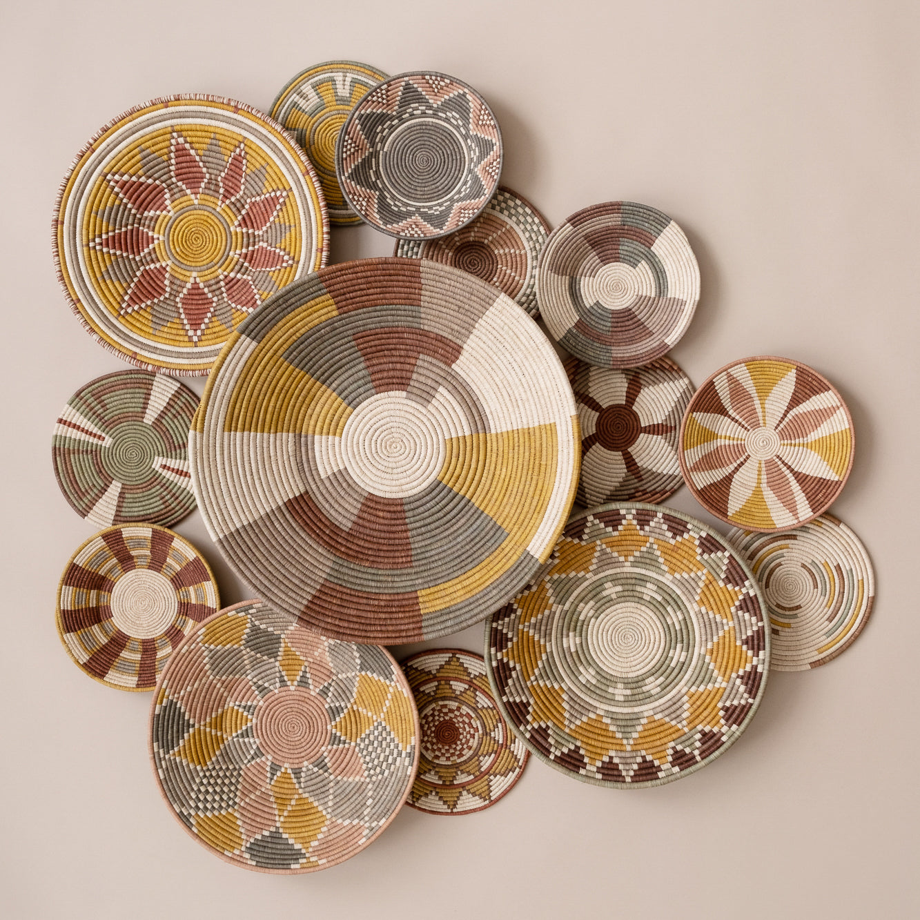 Make an increased impact with a large wall basket!   The larger version of the traditional size adds variation to your lovely wall display. This large statement basket is part of the Elevate Collection, the 2025 annual small batch basket collection. Handcrafted by women artisans from the Batoro tribe living in the very rural mountains of Western Uganda. These weavers are a part of a cooperative that provides training to single mothers, widows and other marginalized women who are subsistence farmers and weave baskets to provide additional income. Made from all natural, sustainably sourced raffia and banana fibers. Unique, bold mix of natural and AZO free dyes - Natural dyes are made from various plant materials grown in artisan’s villages. The women grow, harvest and make all the natural dyes which take a great deal of knowledge and skill to produce.   The hand-dyed raffia is twisted and wrapped around coils of banana fibers, creating structure and intricate designs. Hanging loop on back allows basket to be wall decor in addition to tabletop use Weavers hand make each basket from home while tending to other household duties. Baskets can take days to weeks to complete with artists weaving 3 or so hours per day while balancing other responsibilities. No two baskets are identical - there will be slight variations in size and color from the one shown due to the handmade nature of each product. Each basket is both special and unique. HANDMADE IN UGANDA APPROXIMATE SIZE: 18" x 4"