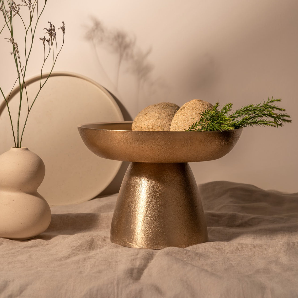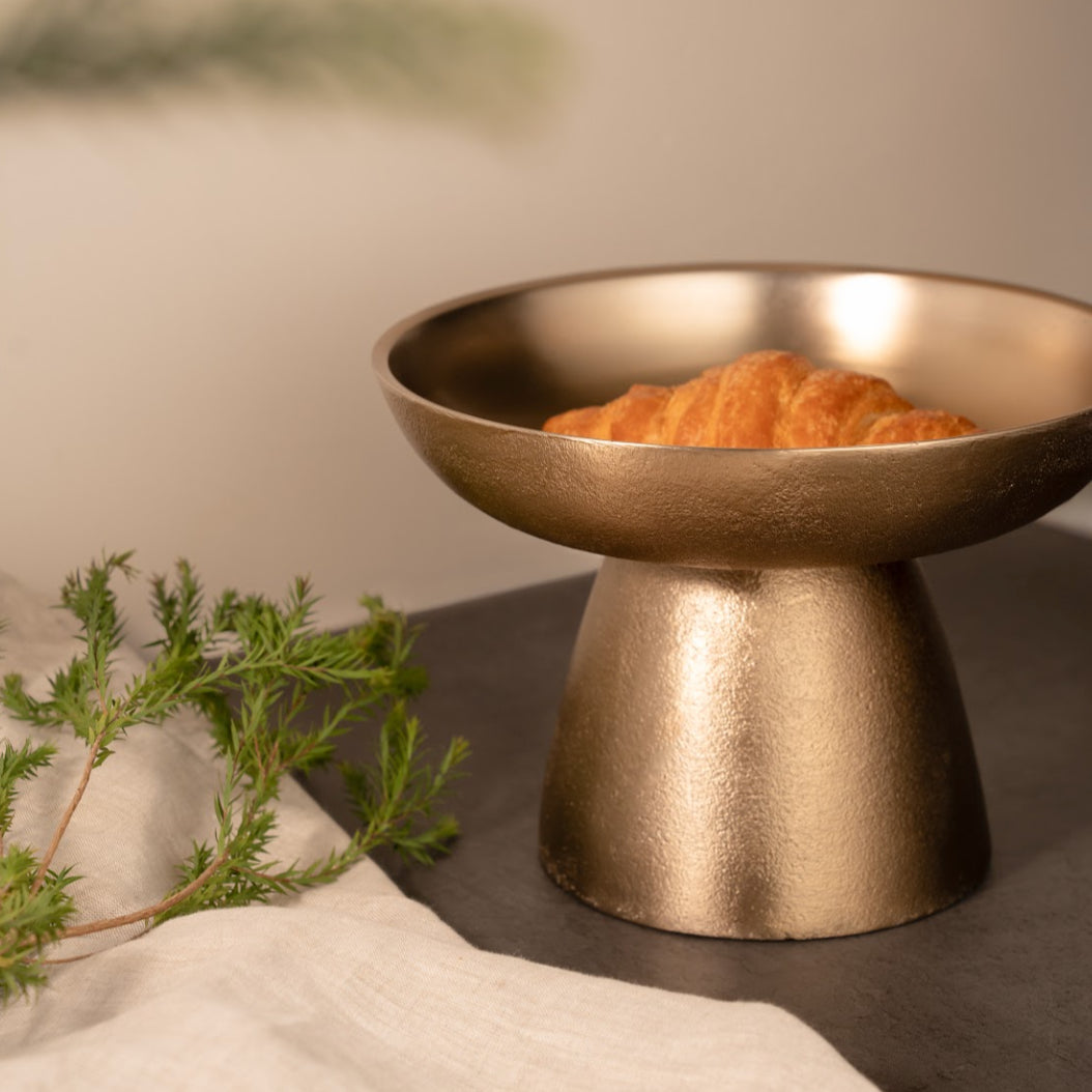 The Collective Home's Stinson collection became more expansive this season, with the introduction of these modern, rounded Pedestal trays. Cast from lead-free aluminum, these substantial serving and display pieces feature a food safe antique brass finish that complements any decor. Their slightly cup-shaped tops flaunt a smooth serving surface, while their tall bases reveal some texture from their sand-cast origin. Set includes two small pedestals.
