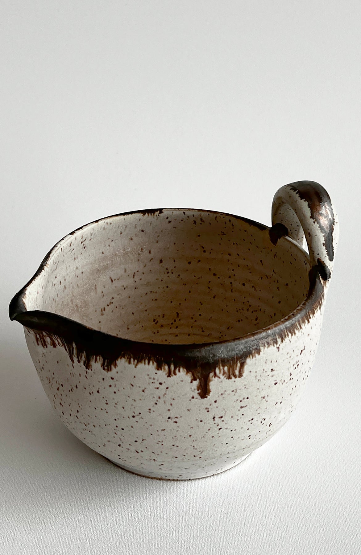 The Luna Collection is crafted from brown stoneware clay and glaze in an off-white glaze with bronze accent at the lip. Each item is hand thrown. This bowl is perfect for mixing and pouring your favorite recipes. I use mine for omelettes and pancakes. Approximate measurements: 5 inches tall x 5 inches wide. Microwave and dishwasher safe however hand washing prolongs the life of your handmade wares. *All of my products are made by hand and will vary. Each glaze firing varies as well. Please keep this and my refund policy in mind when you place your order. Thank you.