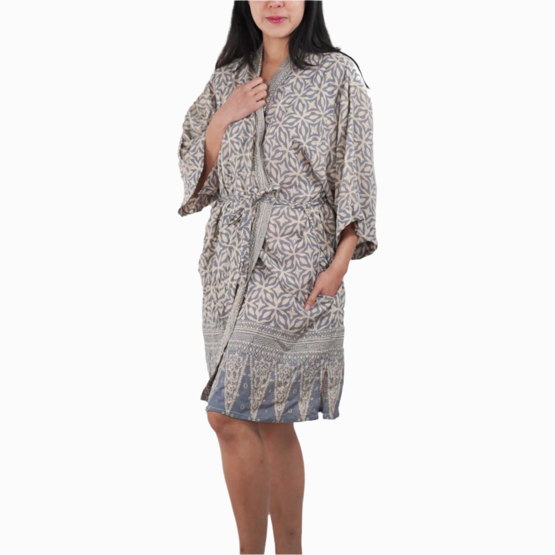 Handmade Batik Robe Kimono, 100% Cotton Soft, Gray White Harmony