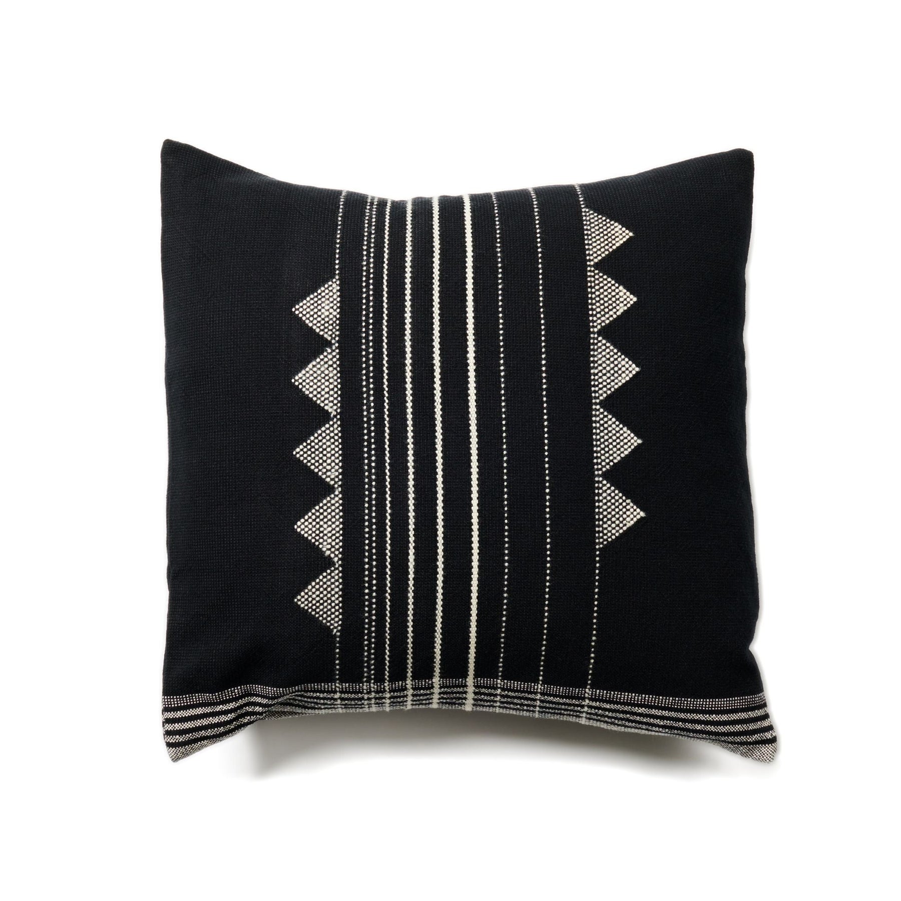 Kora Black Pillow is a slightly textured handwoven pillow where our artisans have skillfully blended handspun yarns like silk, wool and organic cotton. The beauty of this pillow is in its pure design that stands out with the blended use of un dyed yarns left in its natural state. This classic design is hand washed in a special way so that the texture of the natural yarn becomes its own design element. Kora means raw in Hindi language and we see this textile standout with its naturally treated yarns left in their raw natural colors ( undyed ) . Requiring attention to detail and finishing, It takes an incredibly skillful master artisan to make this special piece which is unique to the artisan cluster it originates from. Throw Size: 24 " X 24 " ( large plush down filler is included ) Material: 100% Rain-fed organic cotton, hand spun silk and wool all locally and ethically sourced. Color: Black base & White pattern. Artisan Base: Ethically hand woven by artisans in India Wash care: Gently hand wash with cold water and hang dry or delicately dry clean only. What Makes Your Purchase Sustainable? 100% natural hand-spun yarns used. Support employment of women artisans & local farmers. 100% handmade manufacturing process by artisans. Low carbon foot print as the cotton is 100% rain-fed. Use only 100% natural + biodegradable responsibly sourced materials. Small batch production ensures higher quality & less wastage. Each product comes in a biodegradable recycled pouch.
