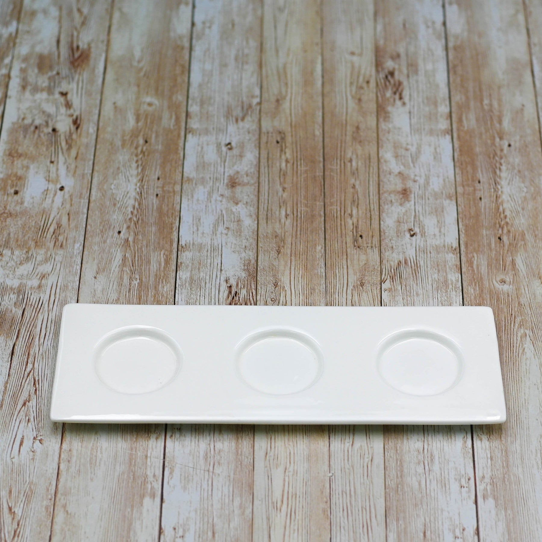 Wilmax bamboo Rectangle 15. 5” tray with a center recessed cut out has unlimited possibilities for serving with or without our fine porcelain this tray can be used as a bread-board, serving tray, or as a vessel for wings and meatballs.