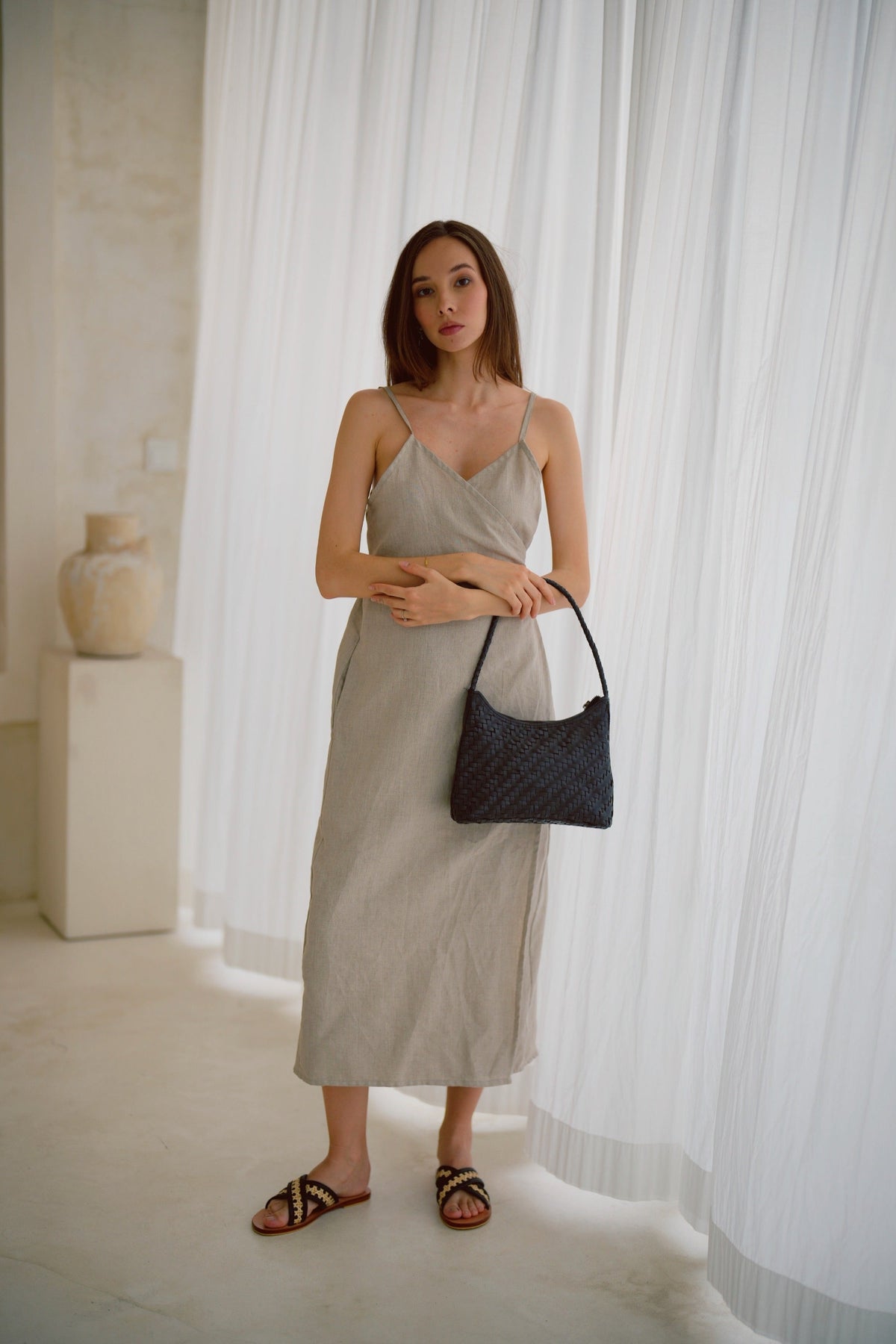 So lovely in this gorgeous midi dress, features in a surplice wrap front silhouette with V-neckline and adjustable shoulder straps, two sided pockets for a chic style. With our made-to-order approach, every piece is created by need which allows our talented artisans to take their time to focus on every detail. Every tailor-quality garment is specifically made specially for you. Every stitch is meant to keep our artisans craftsmanship culture alive. Pink Haley's model is 5‘7” Size S and is wearing One size. Dress length measurement: 41.75” / 106 cm (breast to bottom). Adjustable shoulder straps, wrap-inspired silhouette. Two sided pockets. Hand wash cold. Lay flat to dry. 100% linen. Shipping & Returns: Return accepted for store credit only. Please see our Shipping & Returns page for more details.