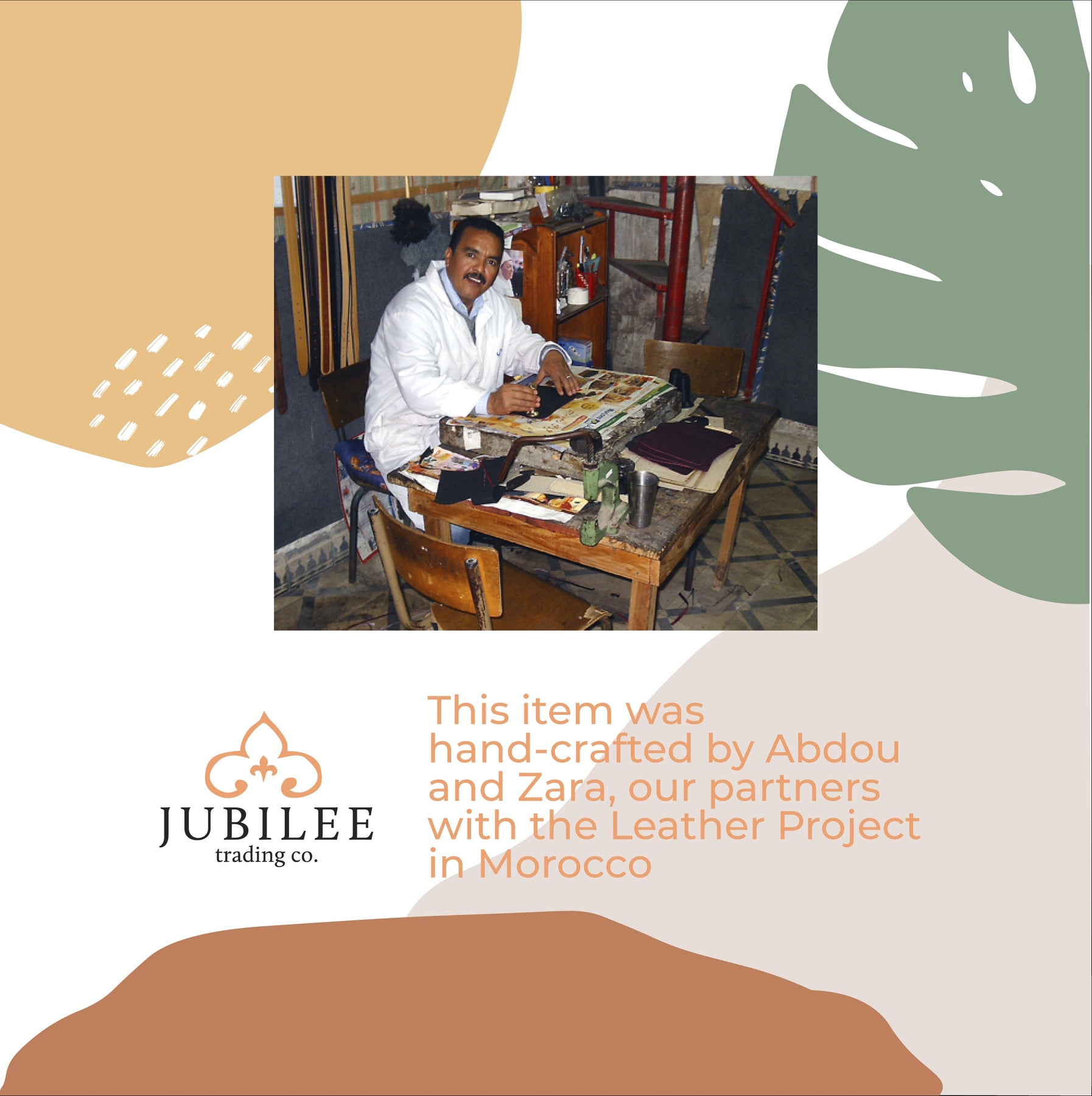 The Atlas Mountains define the Moroccan landscape, separating the Mediterranean coast from the Sahara Desert. Our totes are inspired by these rugged ranges with their simple form built from thick raw cowhide for durability. Measures approximately: 12" wide at top 8" wide at base 5" deep 11" tall 10.5" drop handle for 21.5" total length from handle top to base. Features: *exterior pocket (8.5" x 6.5") *interior pocket (7.5" x 6") *interior clip for keys, etc. *full grain leather from thick, stiff, durable cowhide *vegetable-tanned leather using traditional, centuries-old techniques Each item is handmade and measurements may vary slightly. As leather is a natural material, color tone and texture may vary slightly from item to item. Your natural leather item will develop its own unique patina and darken slightly over time. _______________________ Jubilee Trading Co. is a non-profit on mission to create life-transforming employment in our local community + beyond. We work directly with global artisans to make our goods, as well as provide support for other artisan brands through our warehouse and local team. Every product purchased starts a ripple effect of positive impact. With your purchase, you become a part of this story!