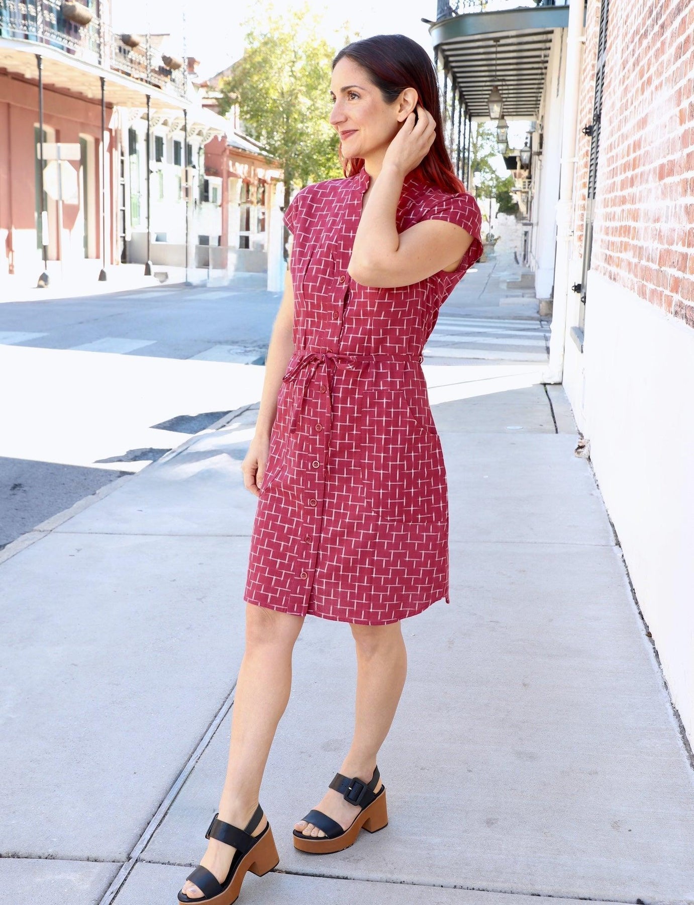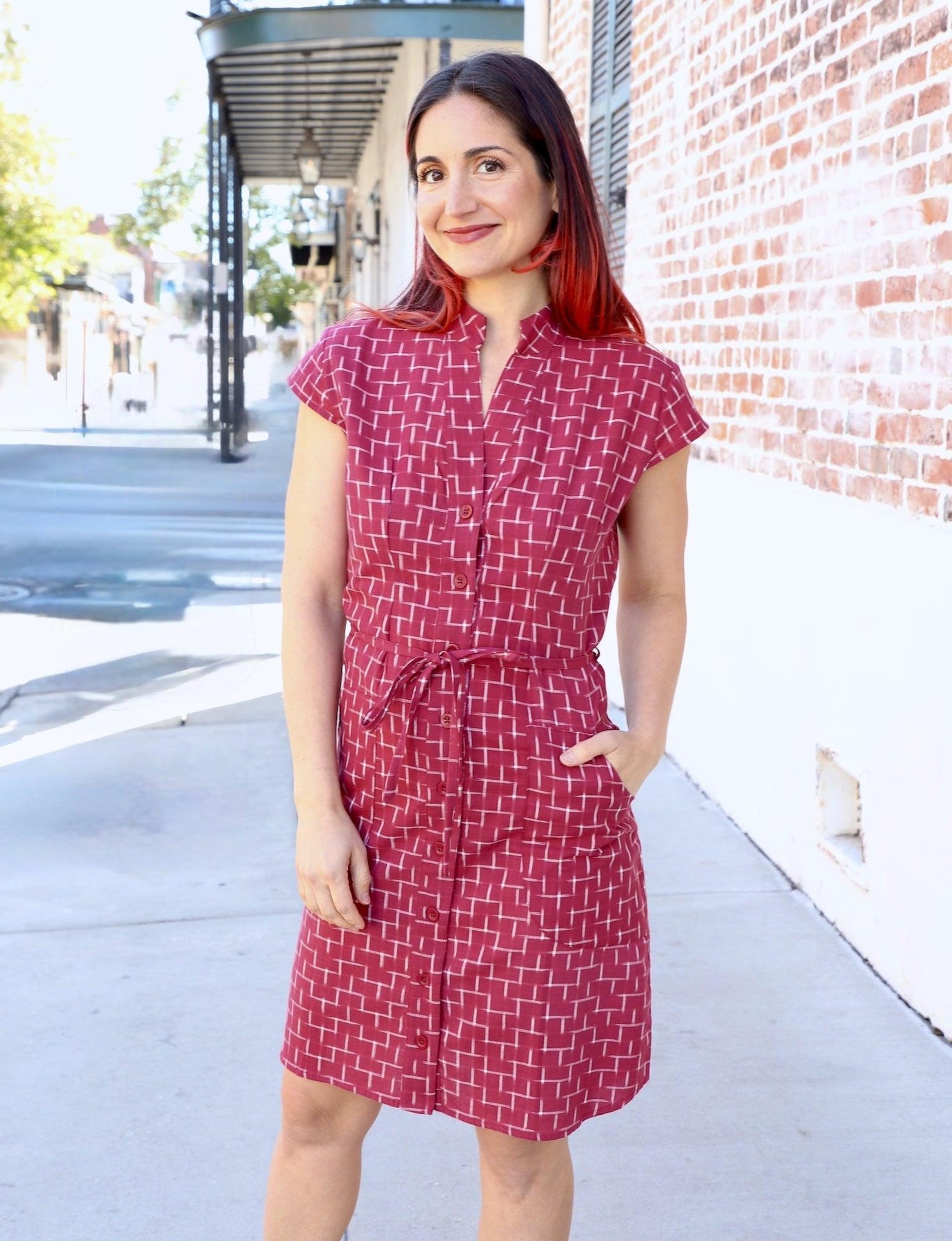 Our best-selling silhouette is back in a gorgeous new handwoven ikat! Our raspberry ikat dress was created with 100% organic cotton on traditional handlooms, making each piece a unique work of art. With a no-fuss button front and comfortable cinch waist, this dress delivers a perfect fit for work or play and everything in between. Plus it has pockets!