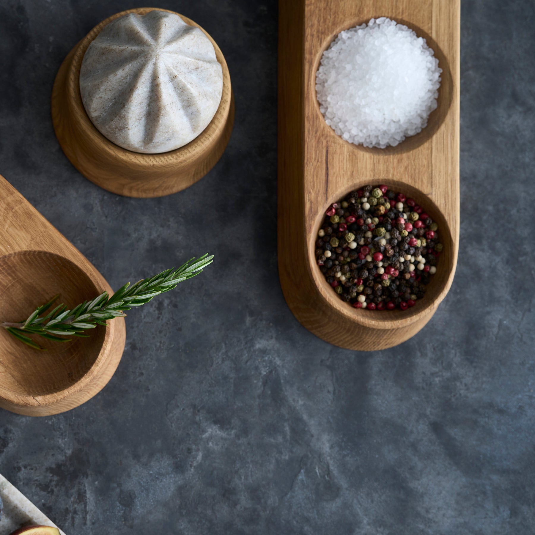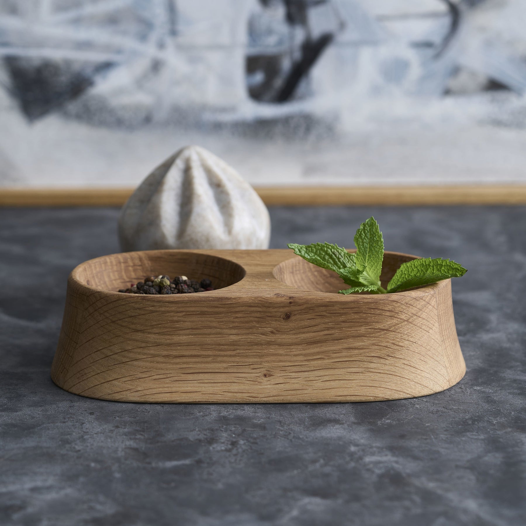 Sculpted from imported oak and paired with a hand-carved marble reamer, this set brings refined simplicity to everyday prep. The rounded tray holds the spherical reamer and, depending on the size, includes additional wells for herbs, spices, or cocktail garnishes. Perfect for adding a splash of fresh citrus while cooking or bartending, it also makes a thoughtful hostess gift when paired with gourmet salts or oils.