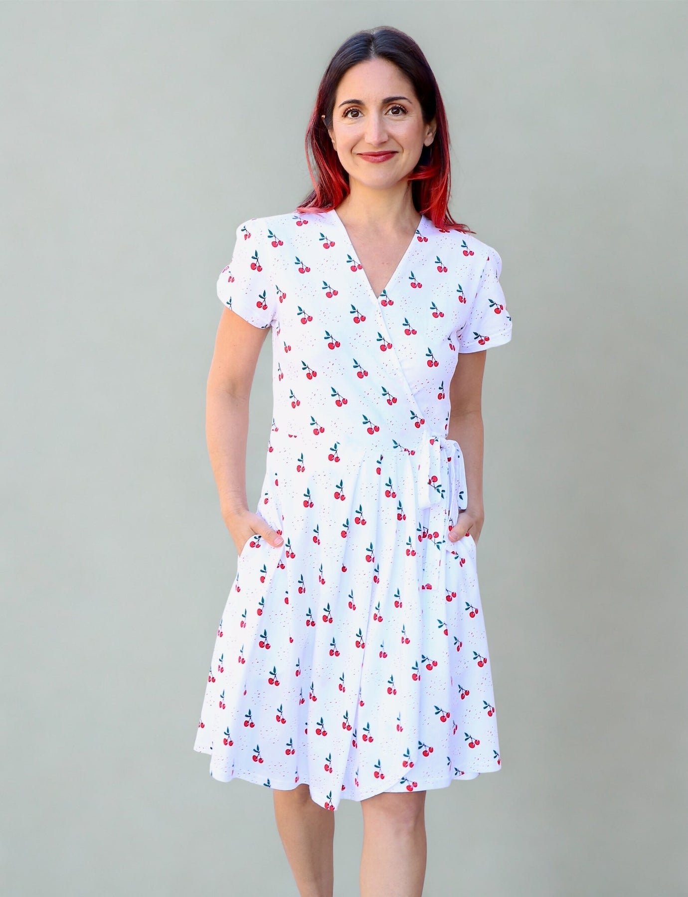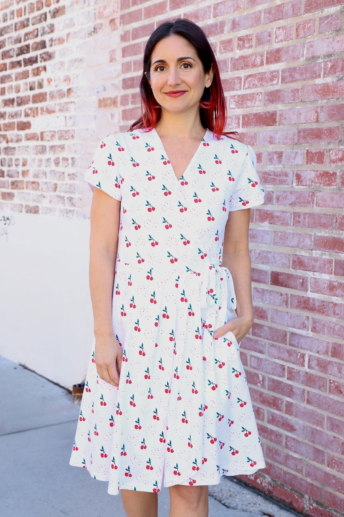 Curve friendly and flattering for all body types. Our cherry print dress is great for nursing or pumping mothers. Plus it has pockets!