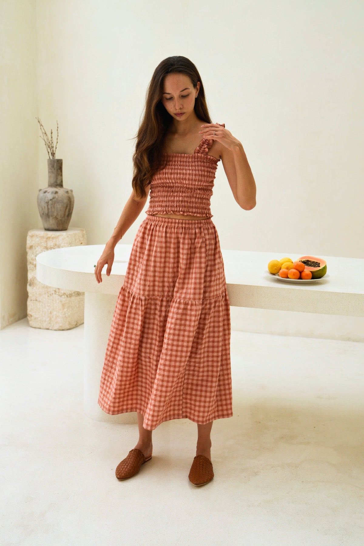 Elena Crinkle Gingham Carry-On Travel Skirt in Persimmon