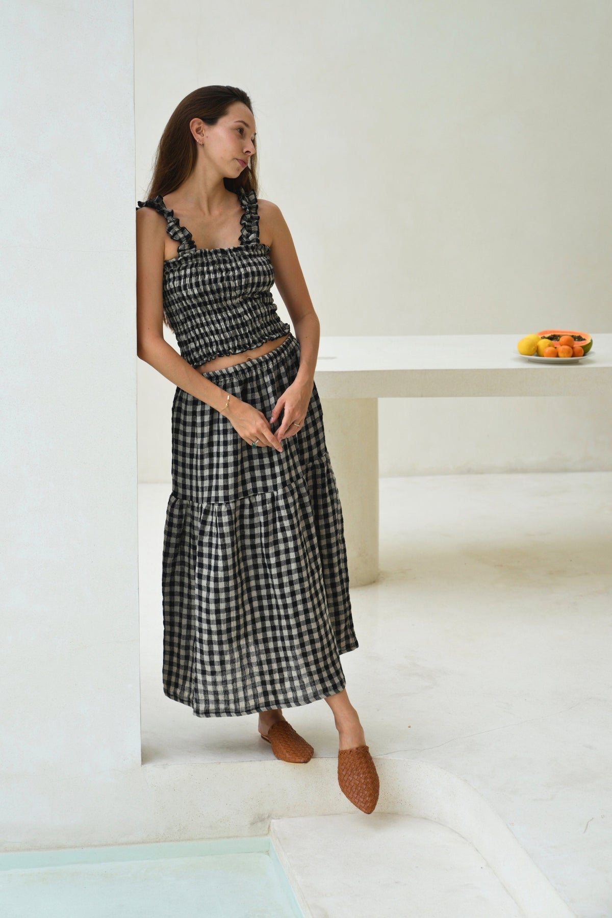 Elena Crinkle Linen Gingham Carry-On Travel Skirt in Black
