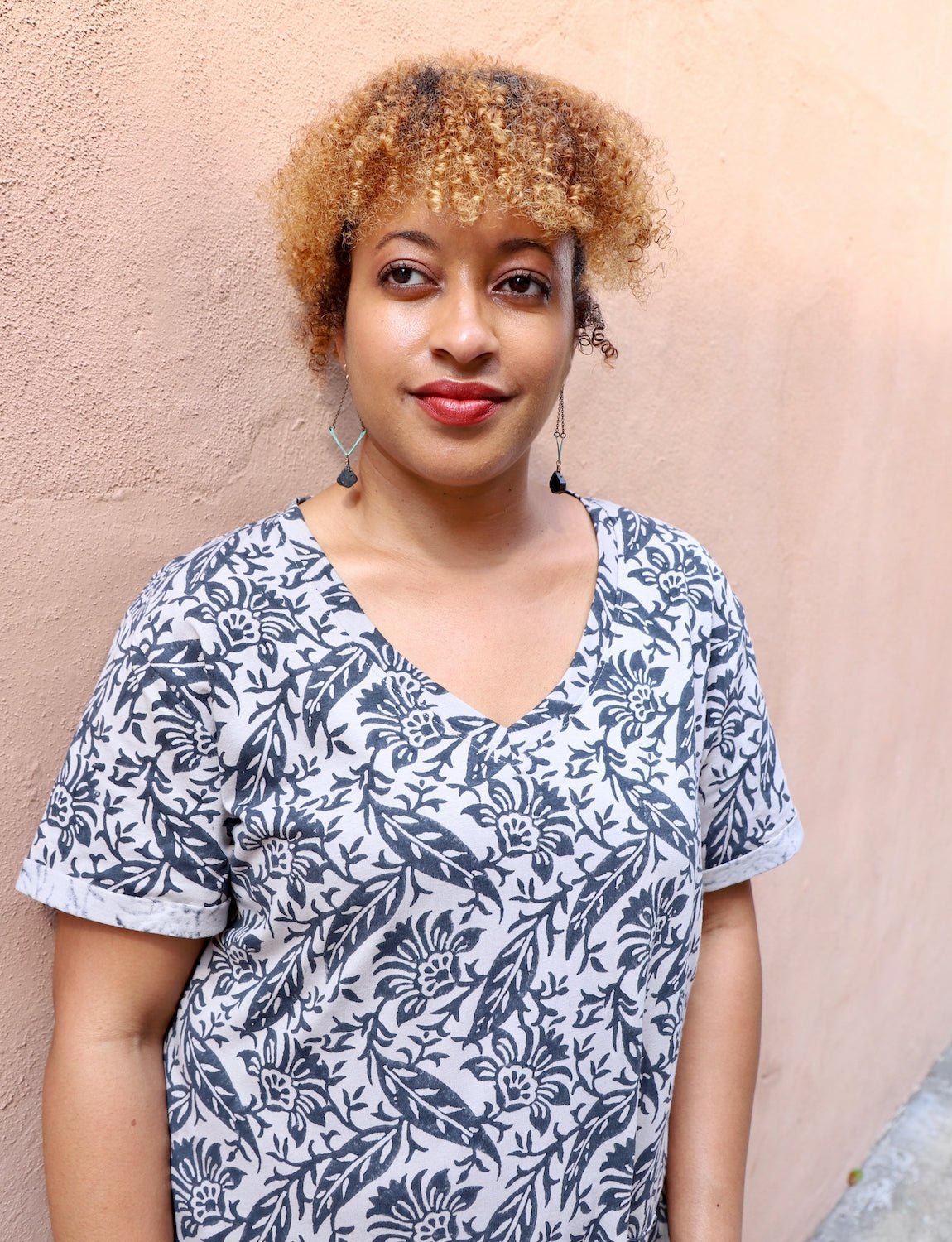 Our Fall Shadows Organic Dress is the perfect way to wear florals for fall and winter. This soft grey and black dress is hand block printed with organic dyes. The relaxed silhouette with a v-neck and short sleeves flatters all body types and layers perfectly under a cardigan for cooler fall days.