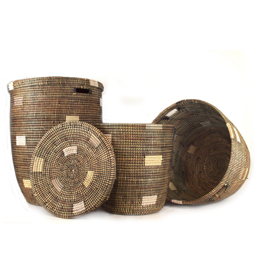Wolof women in rural Senegal weave these baskets from millet grass, and black plastic threads which add strength and durability.