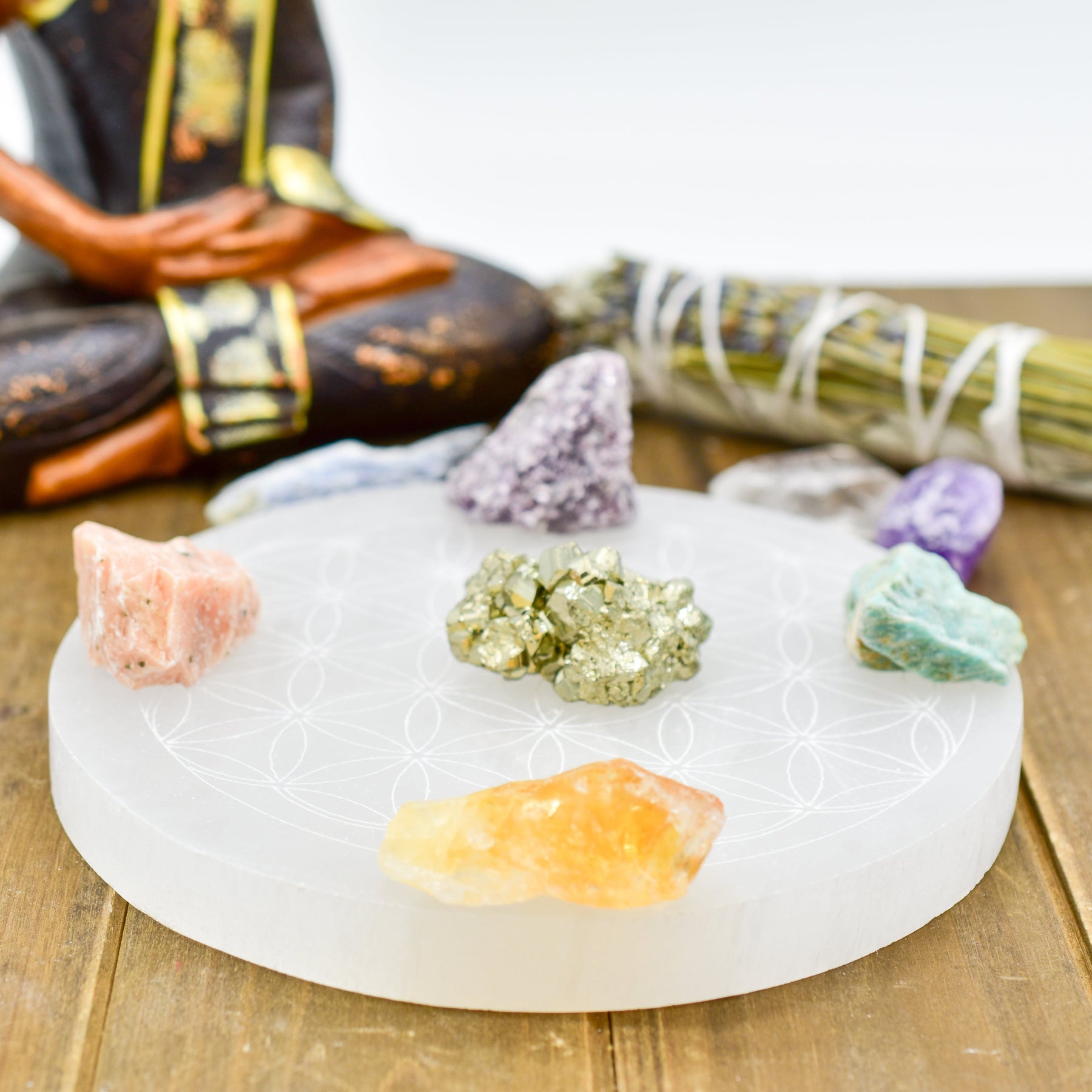 The Flower of Life is laser engraved onto these polished selenite plates, available in hexagon or round. Selenite plates are great for charging your crystals and resetting their energies.