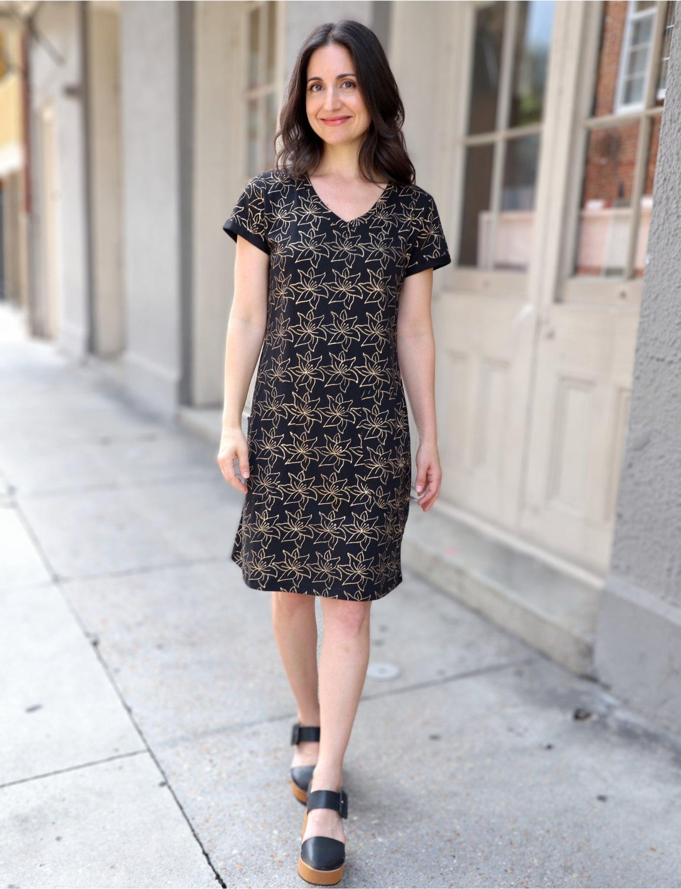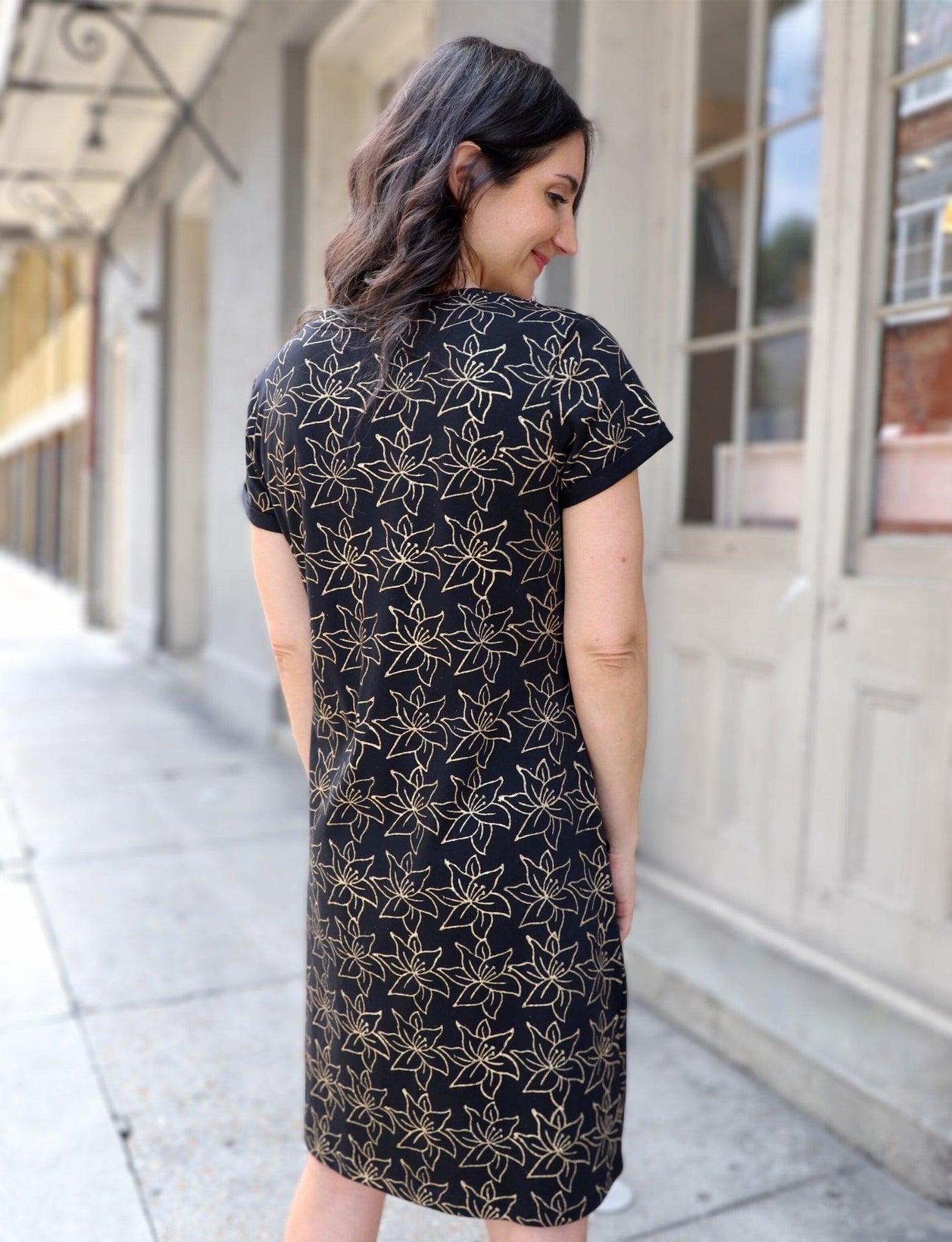 This black and gold dress brings just the right amount of glam to your fall and winter outings—perfect for heading to a Saints game, ringing in the New Year, or just running errands in style. Made from soft, stretchy 100% organic jersey cotton and hand block printed with a gold floral design, this dress combines comfort, versatility, and sustainability. The flattering v-neck, short sleeves, and side pockets make it an easy go-to for dressing up or down.