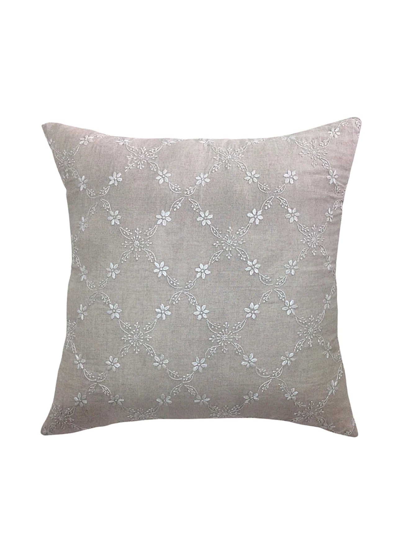 Beautiful lattice embroidered details in shell on one side of the pillow. Lucknow pillows are hand crafted by a women’s co-op in northern India.