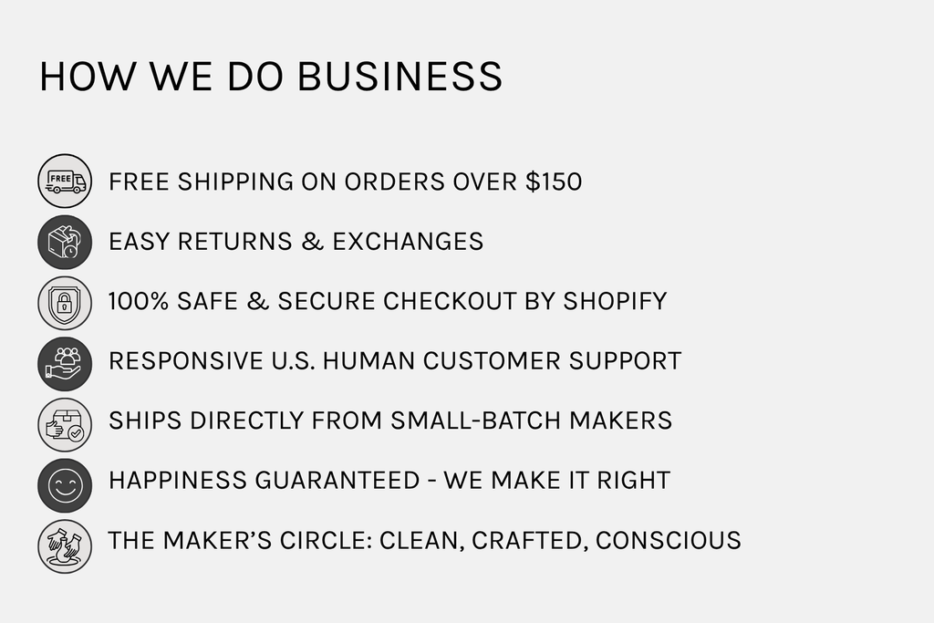We do business like our makers, with care, transparency, and intention. Every partnership reflects our belief that what we bring into our lives should feel aligned and considered. You can shop with confidence knowing our collections honor clean, crafted, and conscious values.