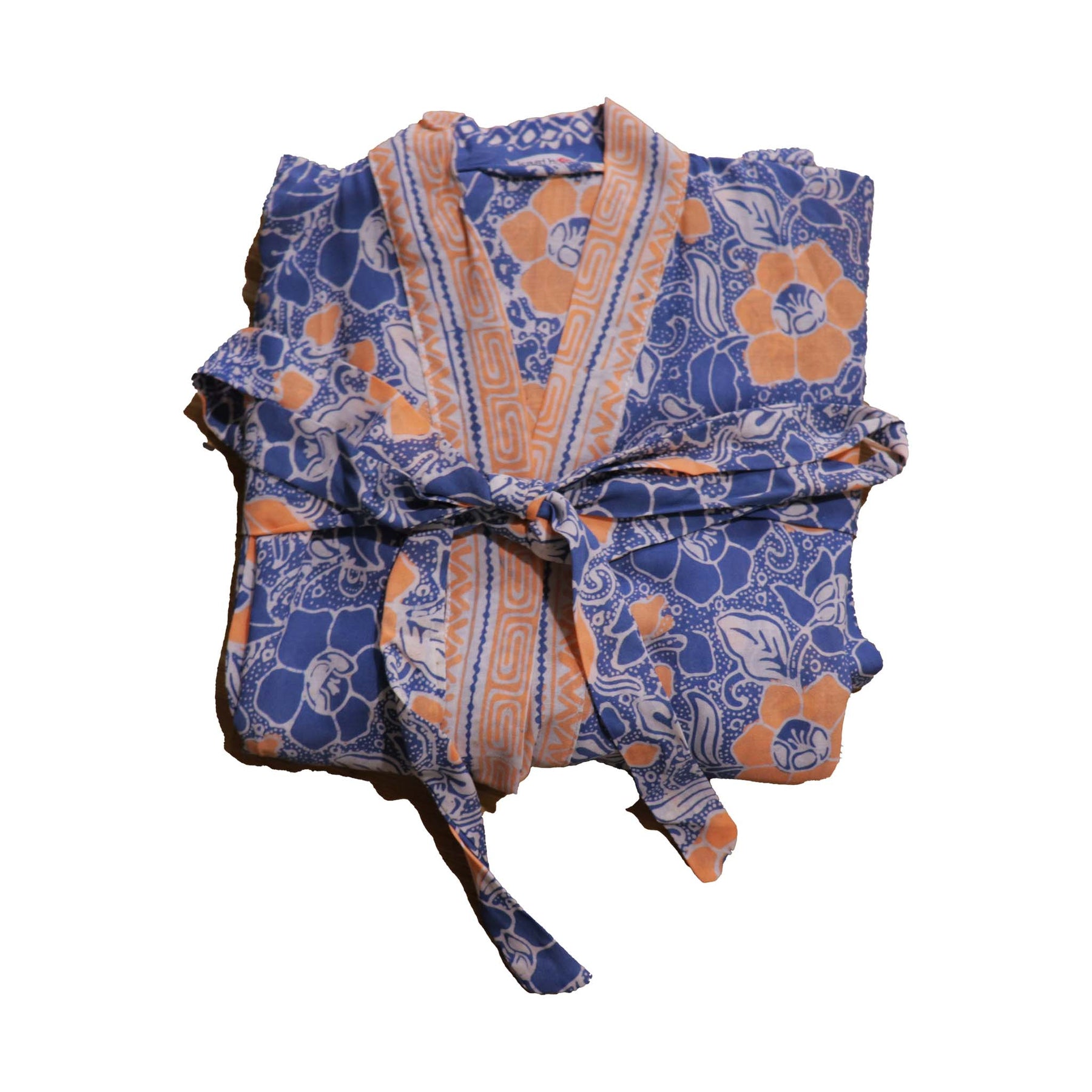 This batik kimono robe is made from white cotton fabric that is then hand-stamped and hand-dyed using 700 years old batik wax and dye technique. The batik fabric is also then sun baked. This batik kimono robe is designed in Manhattan Beach, CA and handmade by artisans in Java, Indonesia. Please expect some variation of the color due to the hand-dyeing and the sun drying process. This pattern is called Sunset Sky Size: One Size. Up to 48" at chest and hips and 41" in length Falls above the knee Made with 100% cotton fabric typically used for hand-drawn batik method Two side pockets Removable waist tie closure Belt loops and inside ties to secure closure Side slits at hem Machine washable in cold and air dry. Wash batik separate from other garments.