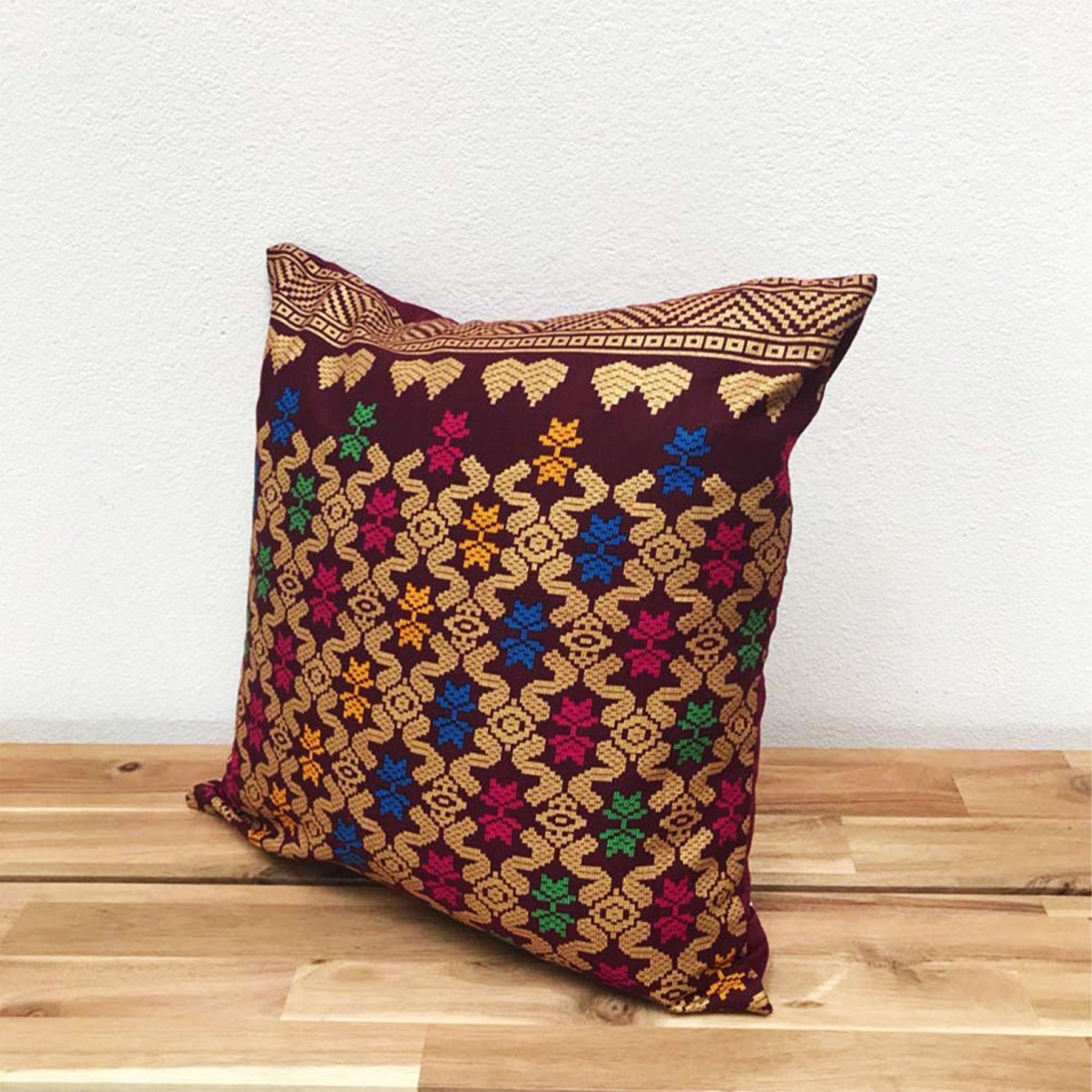 Handwoven Ikat Pillow Cover, Burgundy Red and Gold. Cover Only with No Insert. 16x16 inches, Cushion
