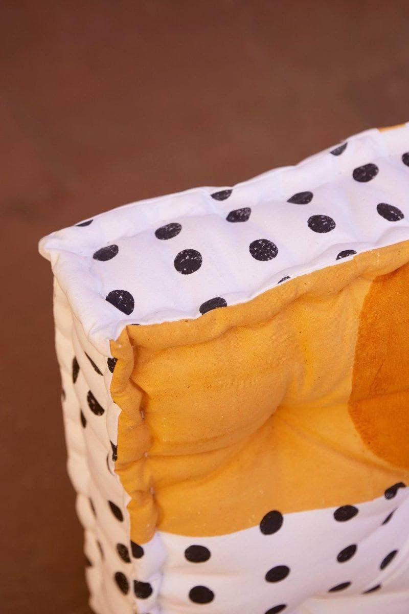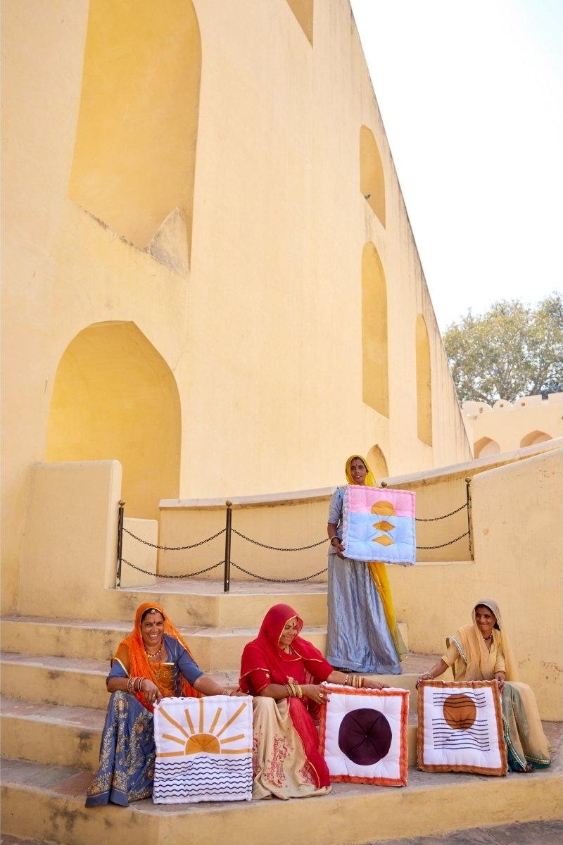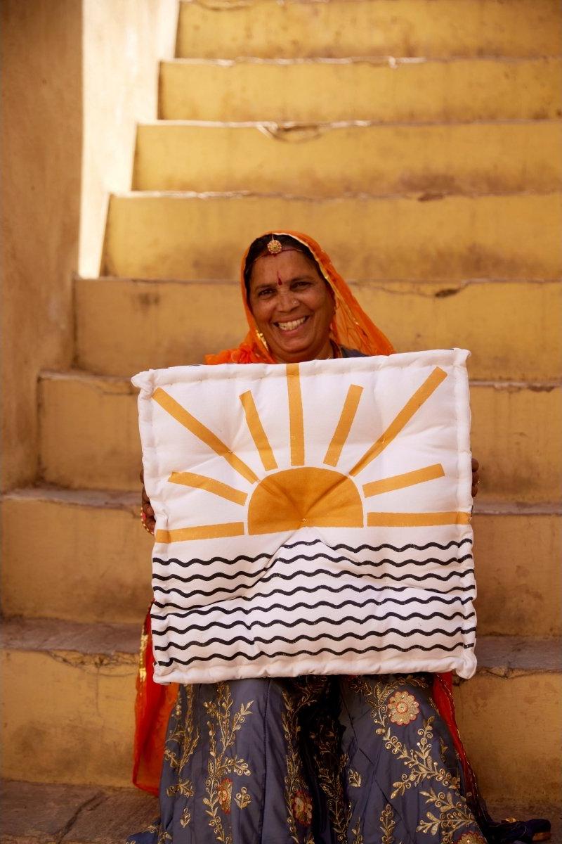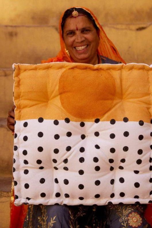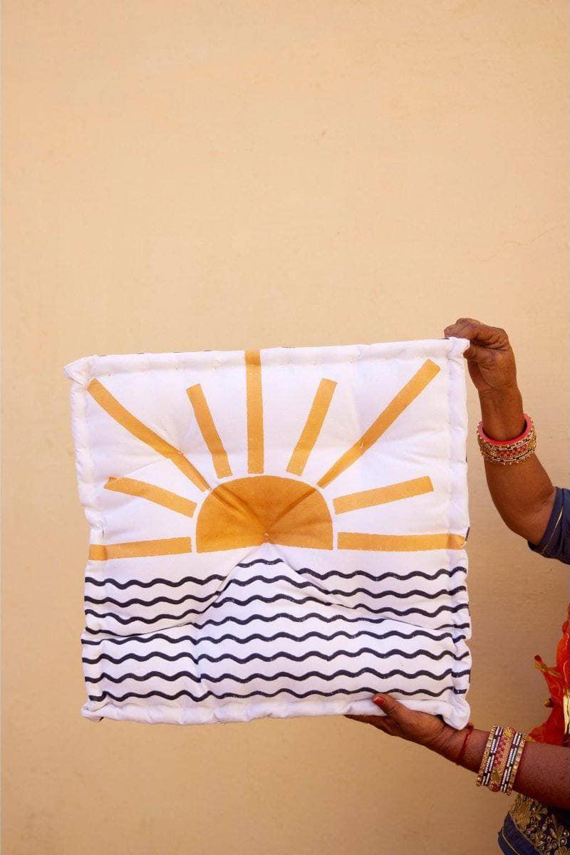 Each floor cushion is handmade, requiring attention from four types of artisans, including wood carvers, block printers, sewists, and dye specialists. The cushion’s design is hand-pressed onto cotton using hand-carved wooden blocks dipped in dyes. The printed cotton shells are then brought to the homes of sewists who stuff and stitch the pillows by hand, creating the final product. CQC LA's floor cushions are made in small batches. Due to the handcrafted nature of this item, expect slight variations in the appearance of each unique piece. - 100% cotton exterior - 100% cotton stuffing - Size: 20" x 20" x 6" - Reversible design - Made in India - Ships from California