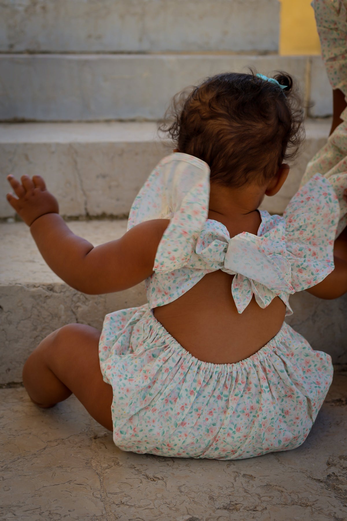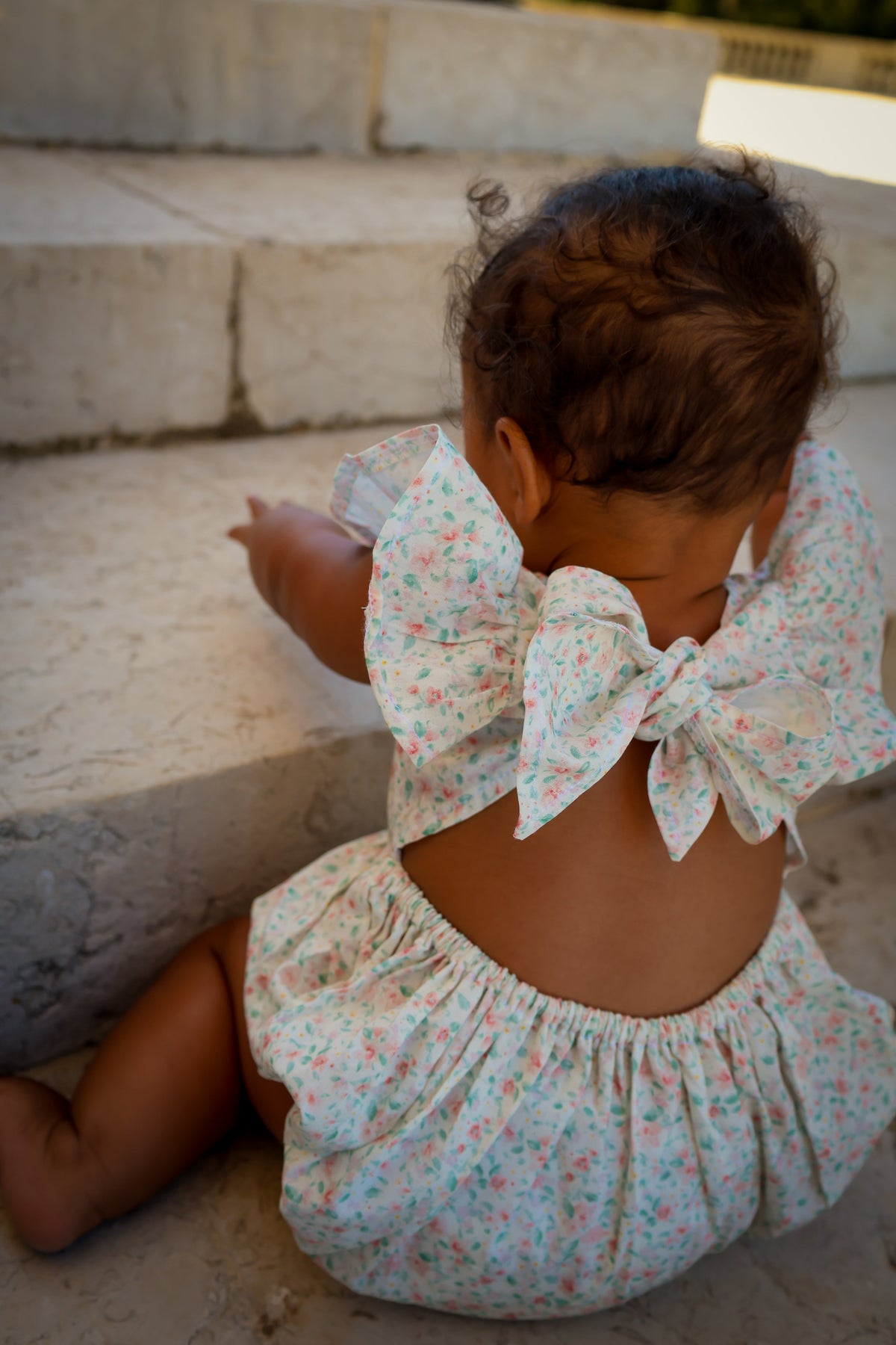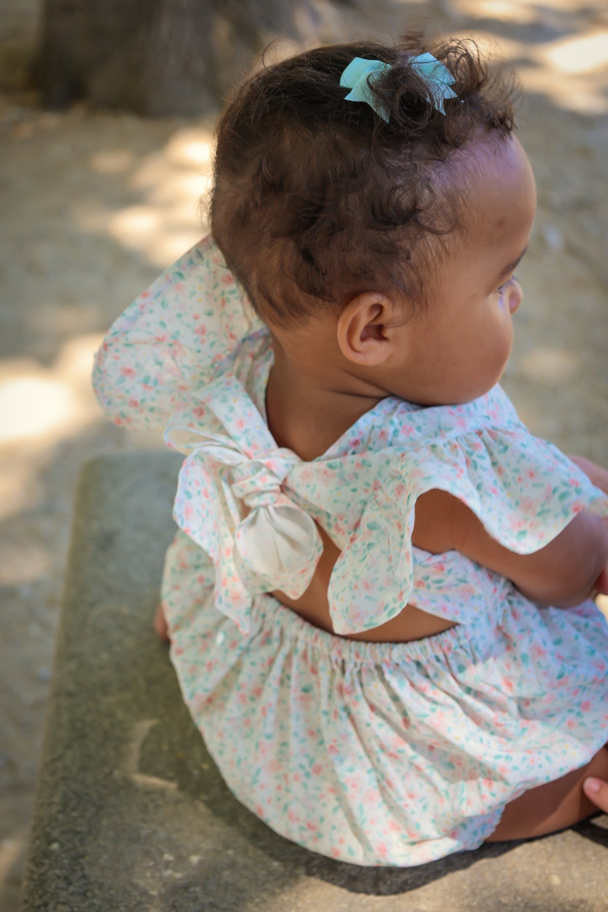 The Josie Bubble in Pastel Confetti is crafted from soft, breathable cotton with a cheerful sprinkle of pastel spots. Designed for comfort and ease, it features elastic leg openings, gentle gathers at the waist for a rounded silhouette, and adjustable shoulder straps that tie at the back for a perfect fit. The snap closures along the inseam make dressing and diaper changes quick and fuss-free, while the lightweight fabric ensures comfort for all-day wear. A sweet and practical piece, perfect for playtime, warm-weather outings, or layering with a cardigan as the seasons change. Machine-wash cold on gentle cycle and hang or tumble dry low. Warm iron if needed; do not bleach, dry-clean. Find more flutter-sleeve bow-back rompers in the Josie Bubble Collection, including Golden Blossom, Soft Petals, Blue Meadow, Garden Blossom, and Lavender Fields.