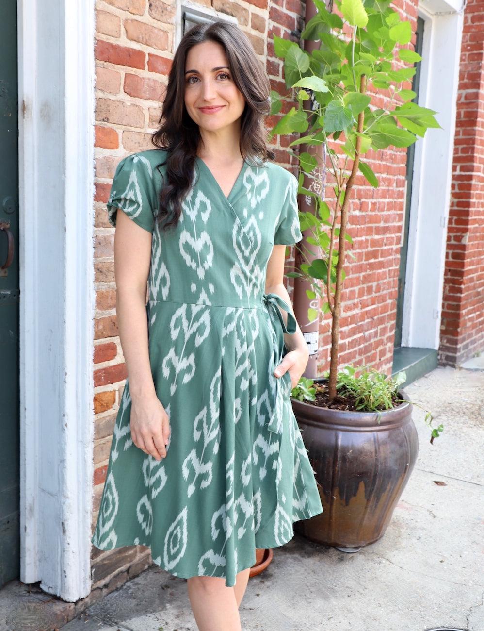 The Khadra Wrap Dress features short sleeves, a button closure at the bust, and convenient side pockets. This sustainable holiday dress is made from 100% handwoven organic cotton in a rich evergreen and ivory palette. The soft yet structured fabric makes it a perfect choice for workdays, special occasions, or everyday wear.