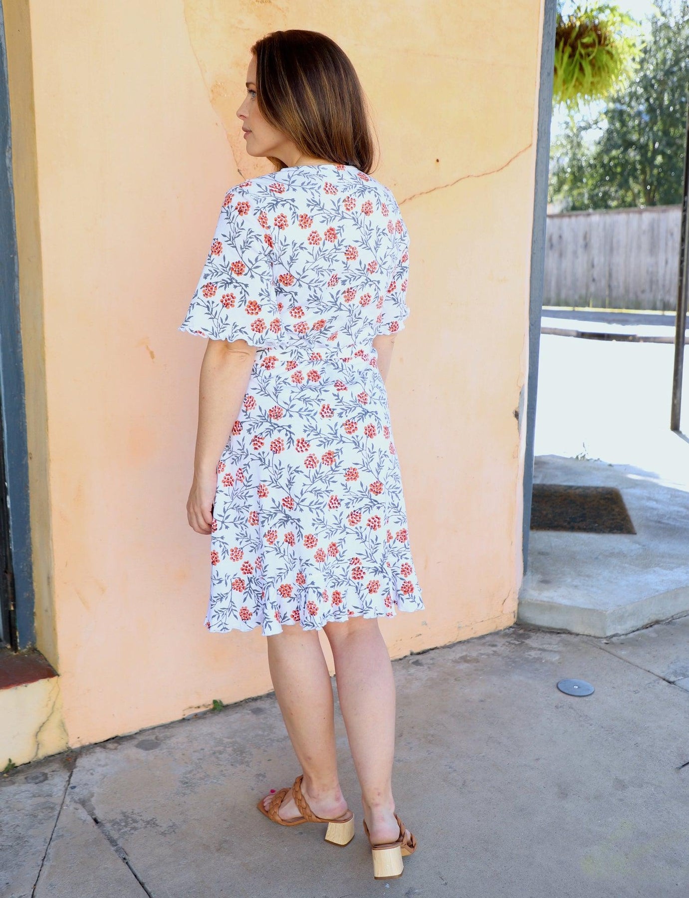 Playful and feminine, our Lata Organic Wrap dress drapes and flows in all the right places. This jersey coral floral dress is as soft as it is sweet. It’s curve friendly and flattering for all body types. Our coral floral dress is great for nursing or pumping mothers.