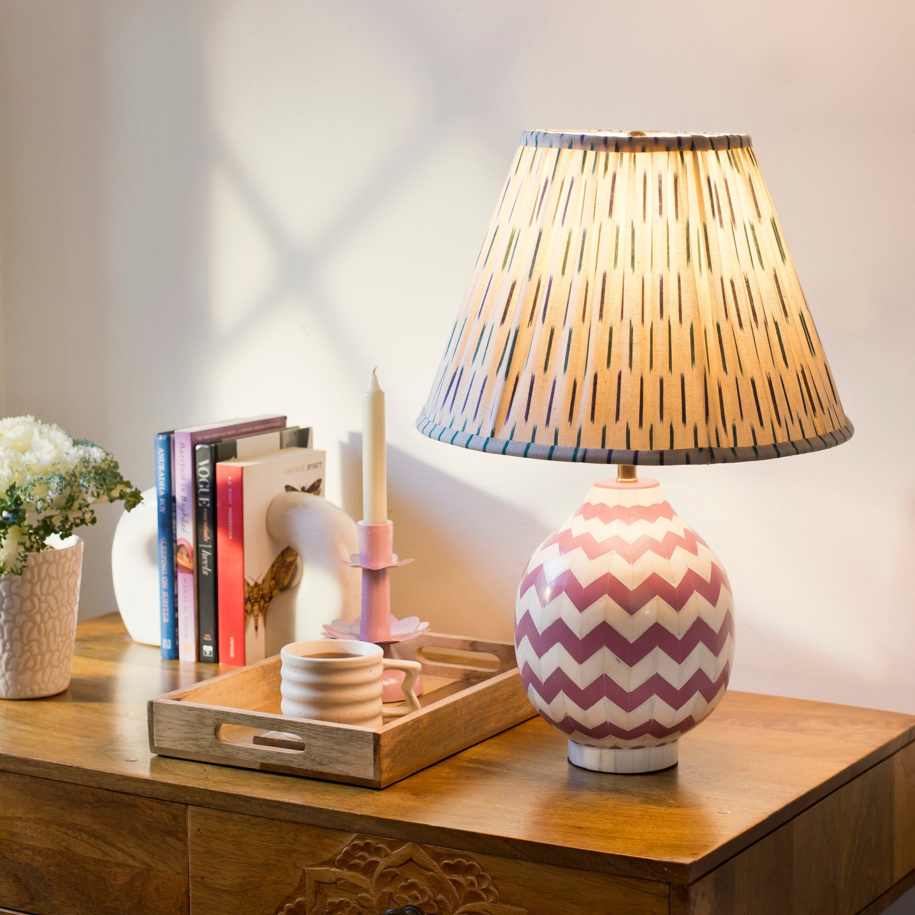The Herringbone lamp base seamlessly blends modern design with artisanal craftsmanship. Adorned with a bold chevron pattern in warm ivory and dreamy lavender, its striking form brings rich texture and dimension to any space.