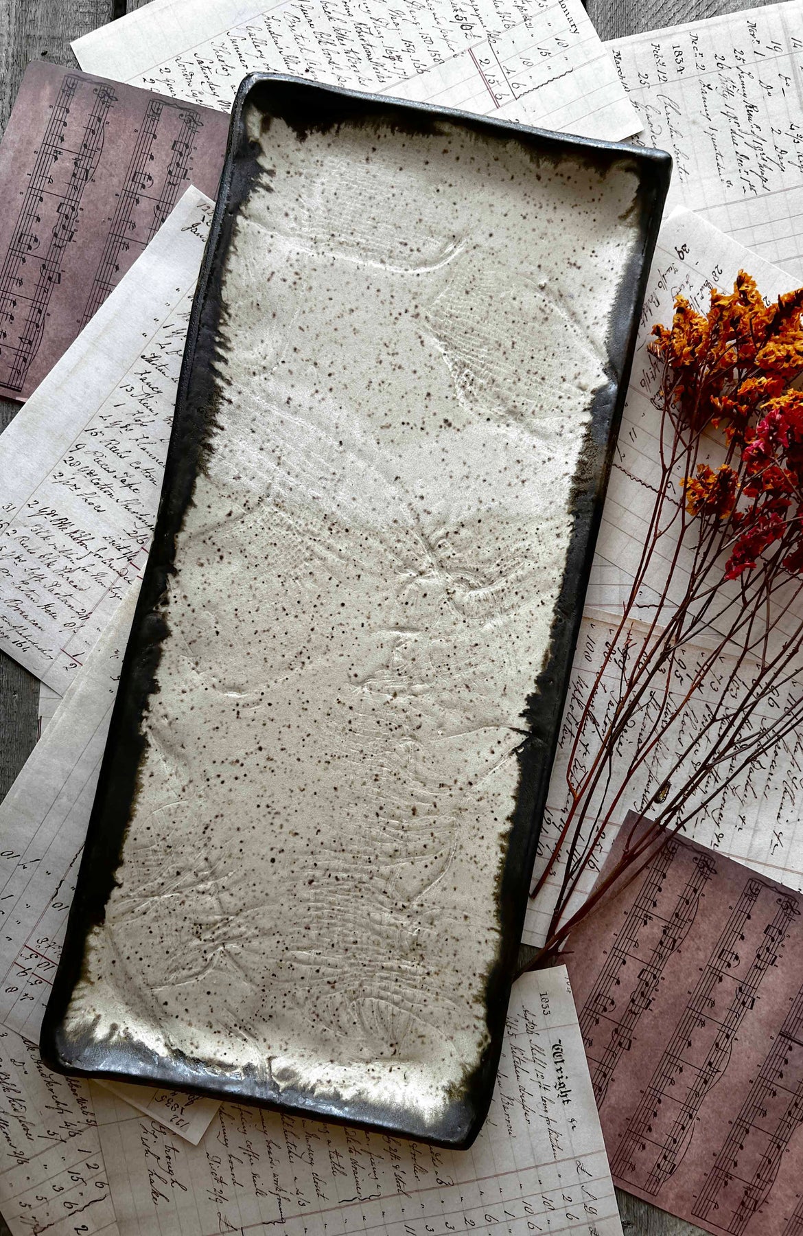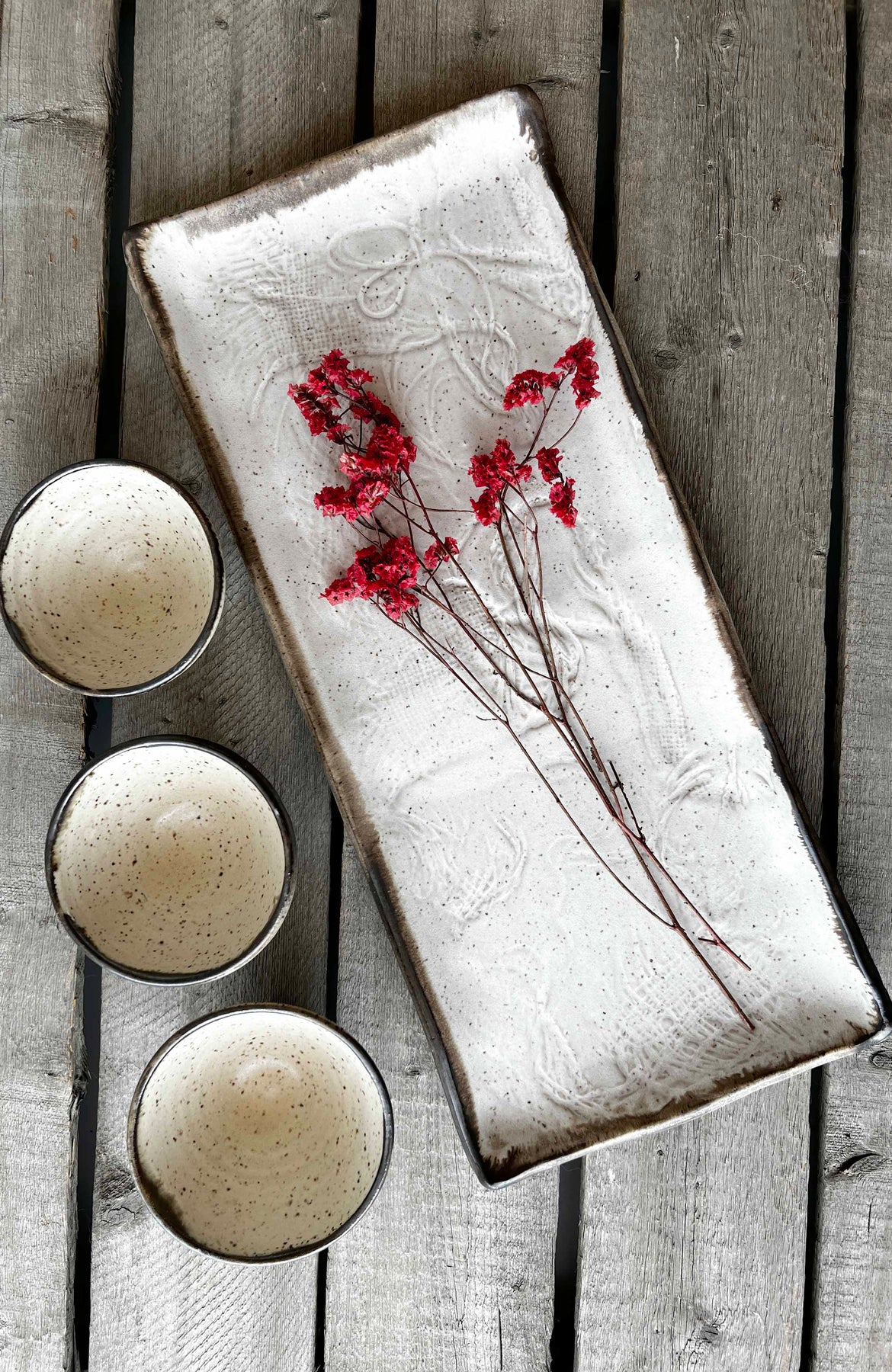 The Luna Collection is meticulously crafted from stoneware clay and adorned with a rich bronze accent at the lip. Each piece is carefully hand built and stamped before being glazed, resulting in a beautifully subtle woven texture. Approximate measurements: 14-15 inches long x 6.24-7 inches wide x .75 inches tall. Microwave and dishwasher safe however hand washing prolongs the life of your handmade wares. *All of my products are made by hand and will vary. Each glaze firing varies as well. Please keep this and my refund policy in mind when you place your order. Thank you.