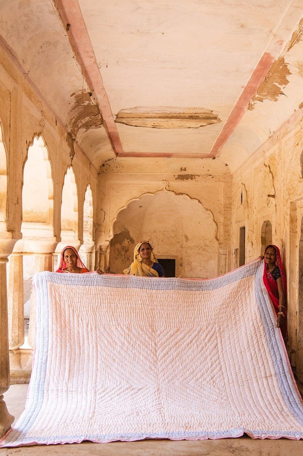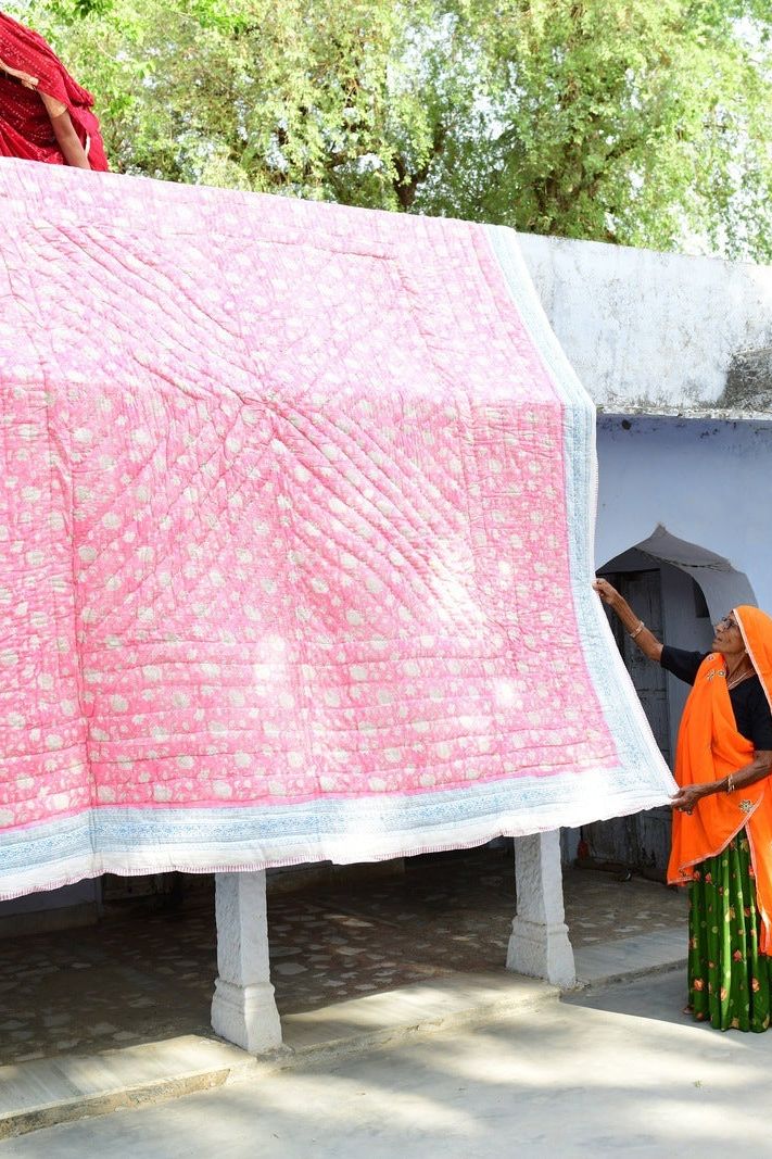 This reversible, hand-printed quilt pairs a soft pink base with classic white floral patterns on one side and a white base with pink florals on the other. It's a nod to traditional design, giving you two timeless looks in one. Each quilt is handmade from 100% cotton and requires attention from four artisans, including wood carvers, block printers, quiltmakers, and dye specialists. The design is hand-pressed onto each quilt using hand-carved wooden blocks dipped in dyes. The printed cotton shells are brought to the homes of quiltmakers, who stuff and stitch the quilts by hand, creating the final product. CQC LA quilts are made in small batches. Due to the handcrafted nature of this item, expect slight variations in the appearance of each unique piece. - 100% cotton voile exterior - 100% cotton stuffing - Made in India - Ships from California - Queen size: 96″ x 96″ - King size: 108″ x 108″ - Sham size: 26″ x 26″