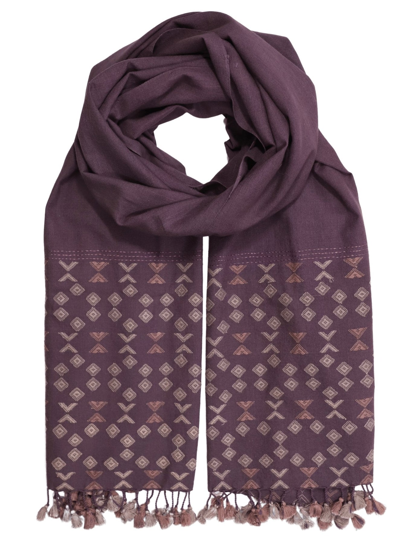 A beautifully hand dyed maroon kutch scarf that incorporates both Kutch weaving techniques and geometric motifs with Rabari hand embroidery. The mauve cotton tassels add another level of elegance to this scarf. This is truly a statement scarf that can be used to spice up your basics or be draped over the shoulders as a shawl for evening attire.