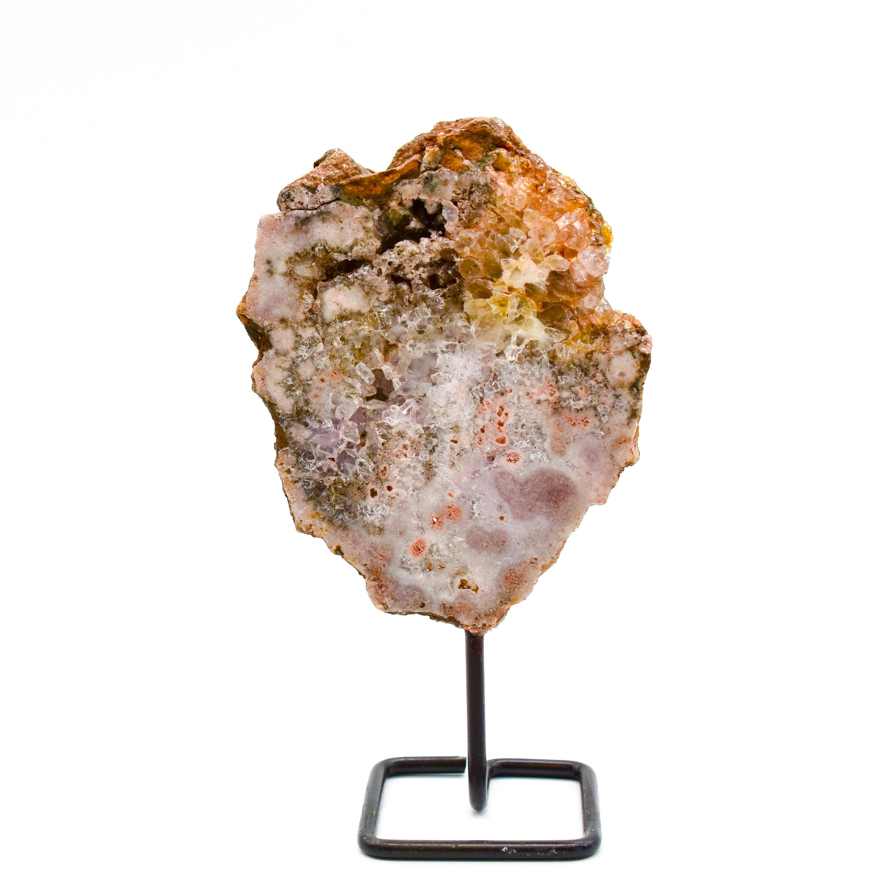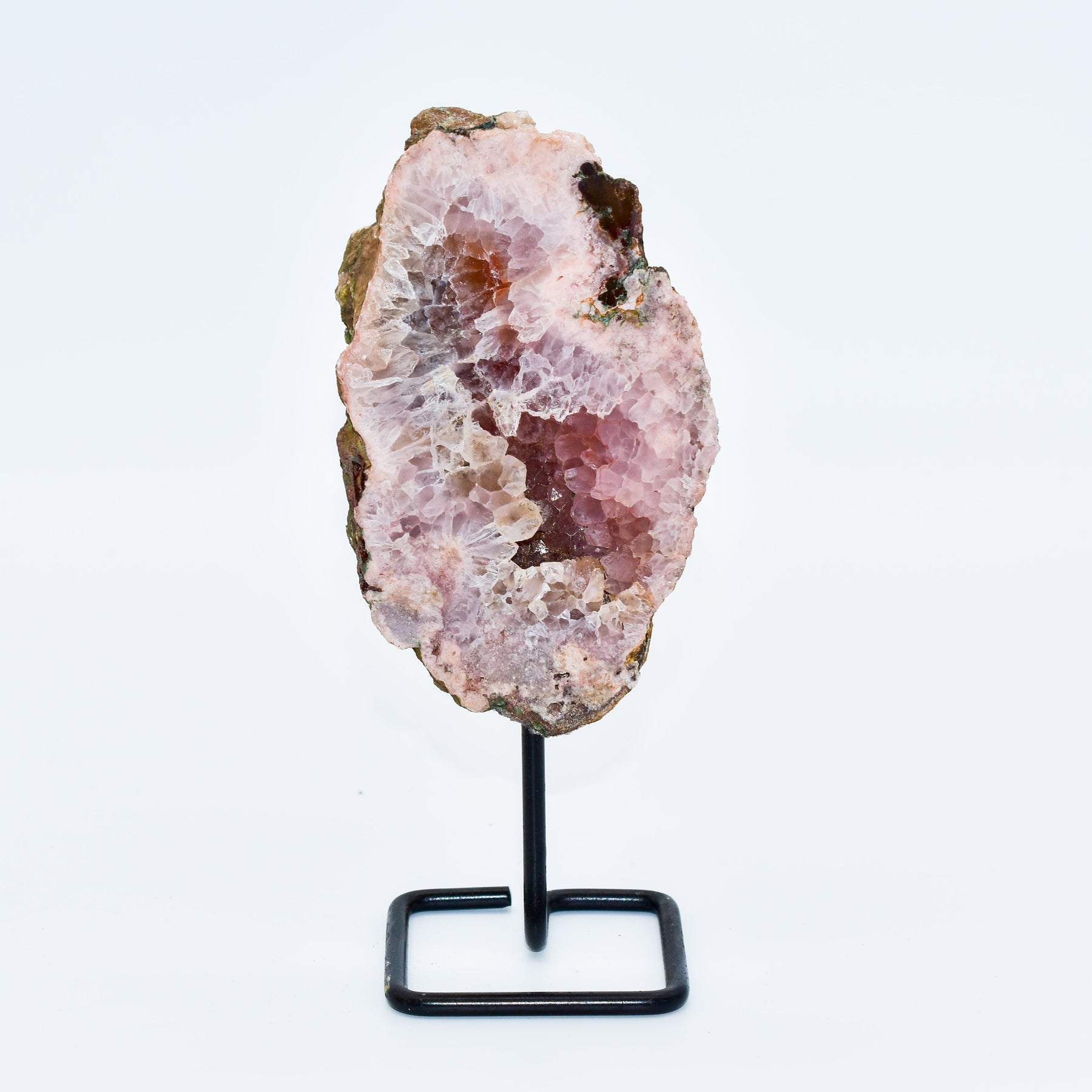Pink Amethyst Slabs polished on one side and mounted on a little stand. Each piece is unique, no two of them are alike. Please note this is a natural stone-each one has different color, textures, weight and size.