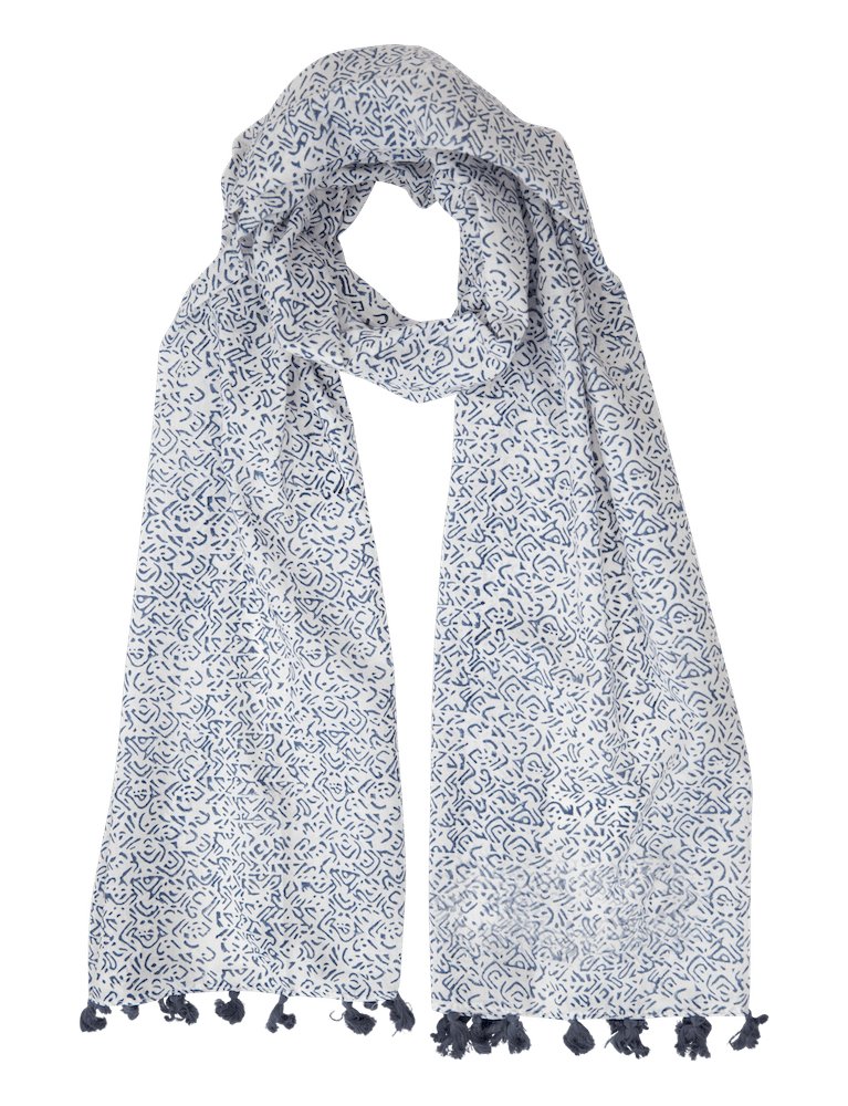A light- weight ethically made cotton scarf that features a blue and white block print and a blue tassel trim.