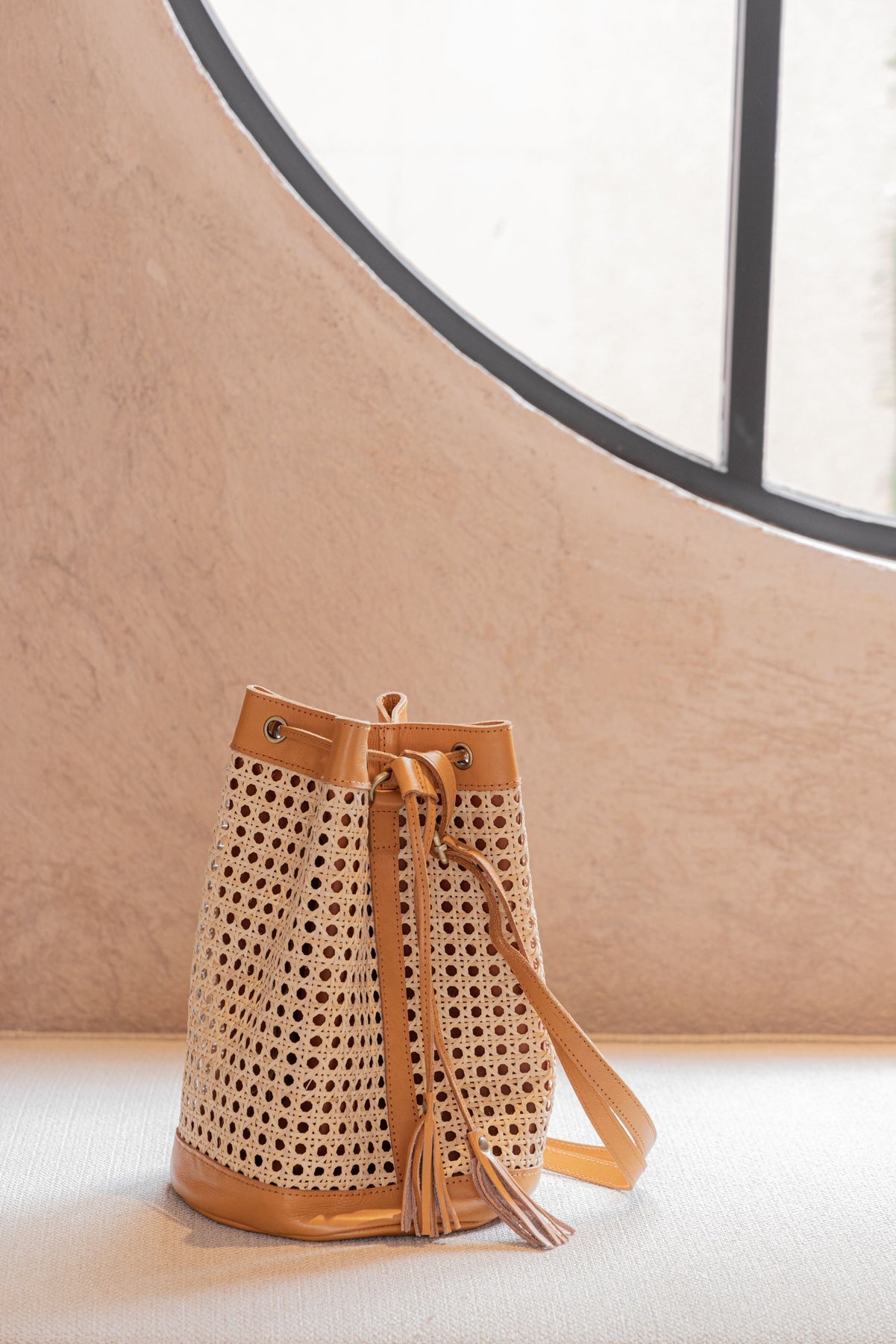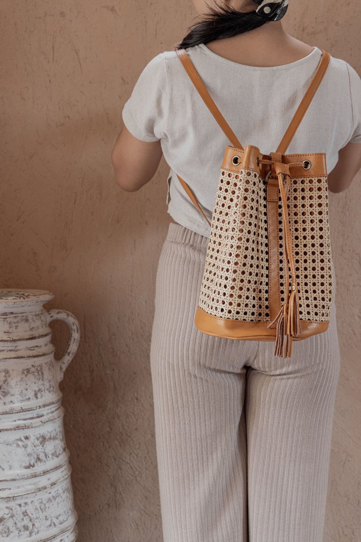 Description This elevated backpack features leather detailing and gorgeous cane webbing. These natural elements combine beautifully to create a sophisticated yet casual feel. Each bag is handmade by our Balinese Artisan Partners and tells a story of craft, culture and innovation. Size 12"x8.5" diameter Materials Rattan Leather