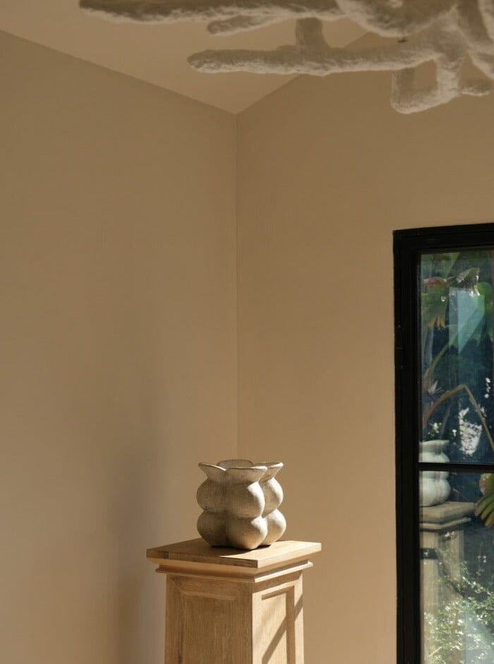 The Ratu vessel from the Sambisari collection is a unique vessel handmade by local Indonesian artisans.   Crafted by talented Bali artisans using a technique that has been passed down through generations. Bring the Ratu vessel to your home as a sculptural vessel or as decoration for shelves or tabletops. Materials: Terracotta clay, cream underglaze, highly textured  matte cream glaze. Size dimensions: 7. 5"w x 8"H  Discover the full collection. See The Vessels E-magazine. Free Shipping within USA.  All Vessels are final sale. See here for more information on our return policy.