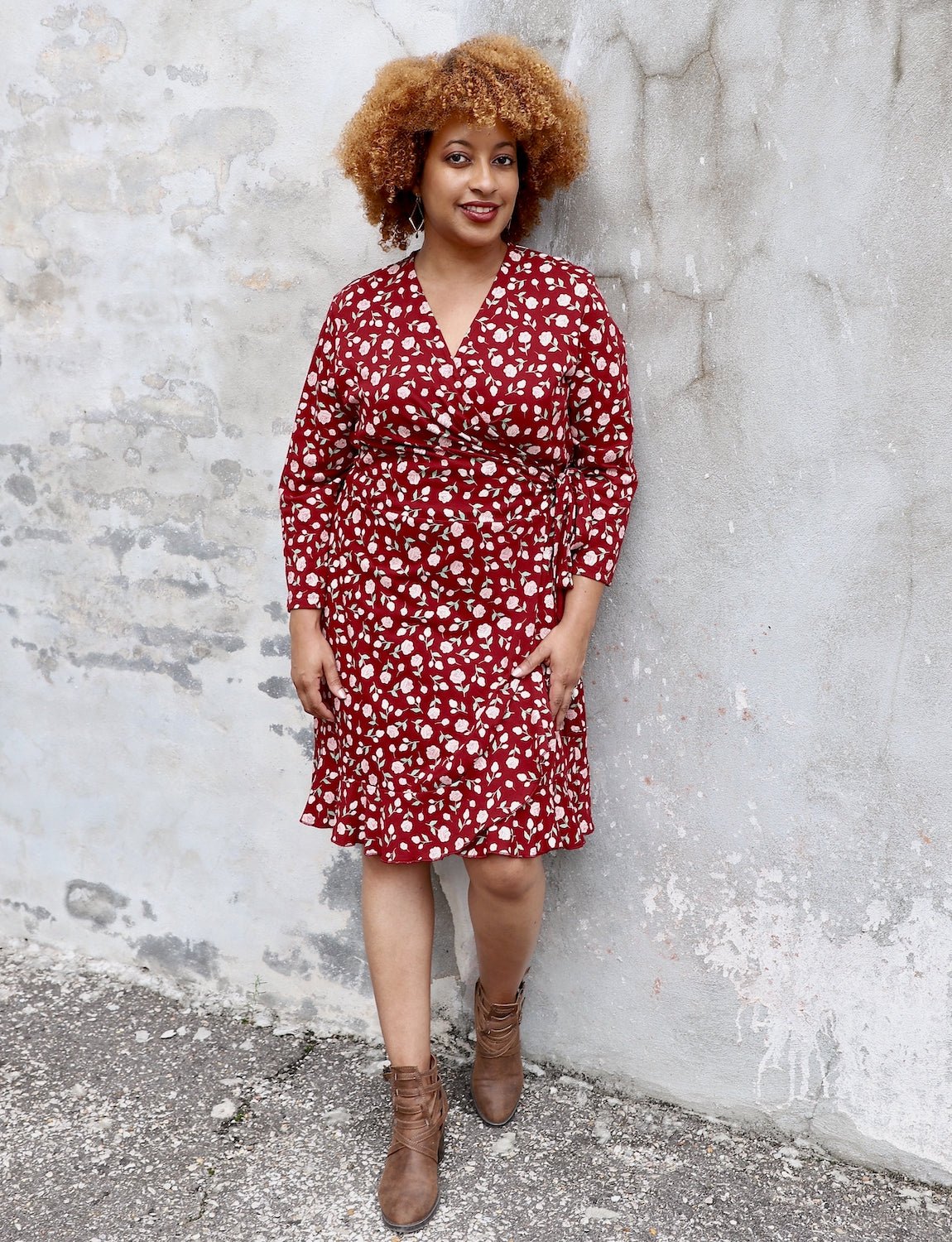 Calling all flower lovers! This is the prettiest winter floral wrap dress you'll ever see! Our Roma Floral Organic Wrap Dress is crafted from 100% organic jersey cotton, making it luxuriously soft and gentle on your skin. Plus, it's eco-friendly – a choice you can feel good about. Artisans hand-screen printed a delicate design of pink roses onto the rich burgundy base, adding a touch of sweetness and timeless beauty.