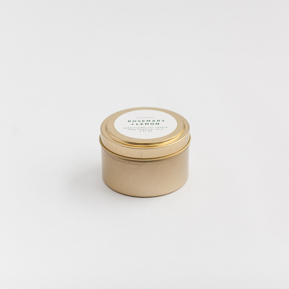From ingredients to vessels, Slow North prioritizes sustainability, using soy wax—a long-burning, biodegradable, and renewable resource. Our candles are poured into reusable, brushed gold travel tins.