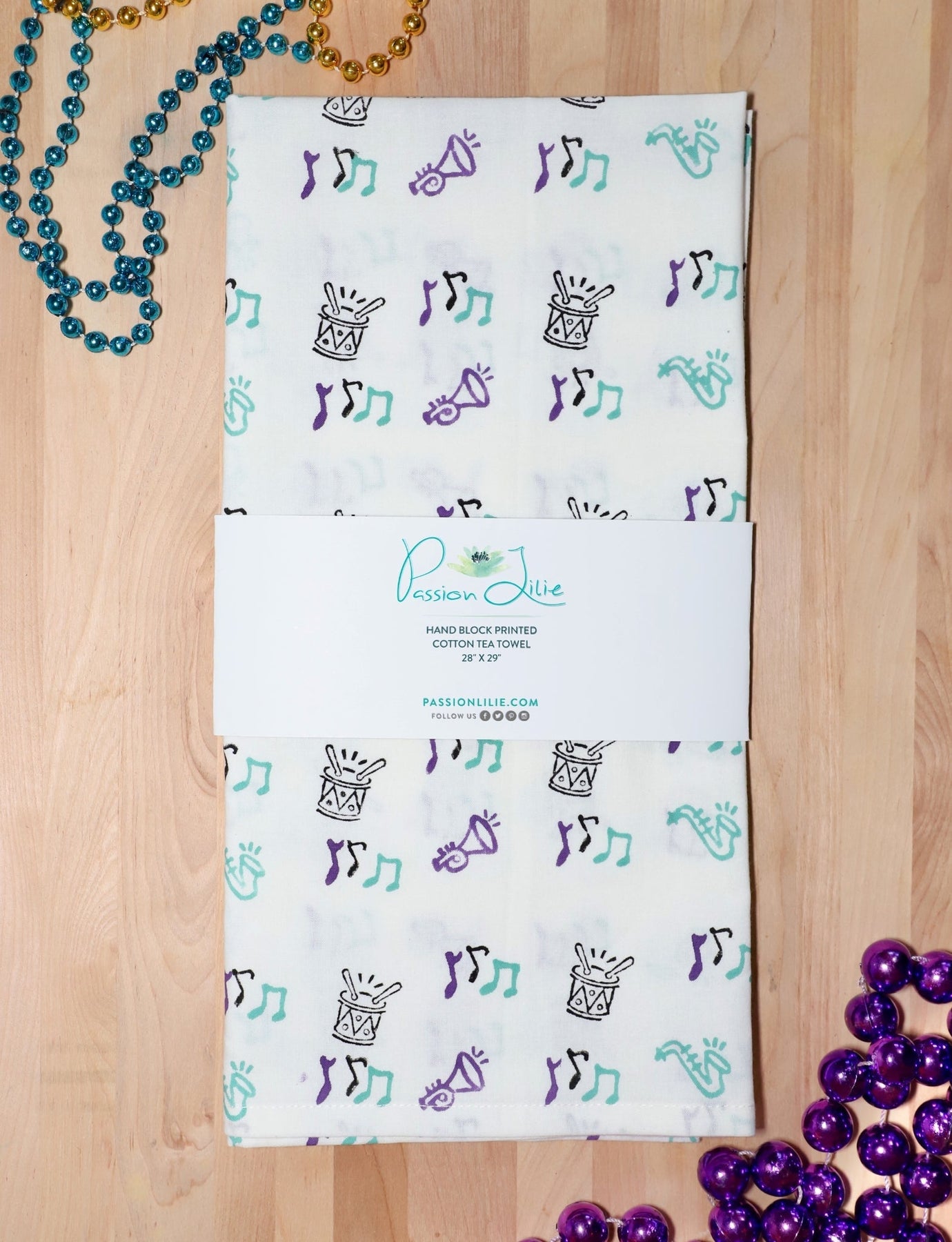 Crafted from premium quality cotton, our second line tea towel features hand block printed musical motifs including saxophones, drums, and dancing music notes in cool purple and teal tones. Its playful designs make it a perfect gift for music lovers, jazz enthusiasts, or anyone who appreciates the rhythm of New Orleans culture.