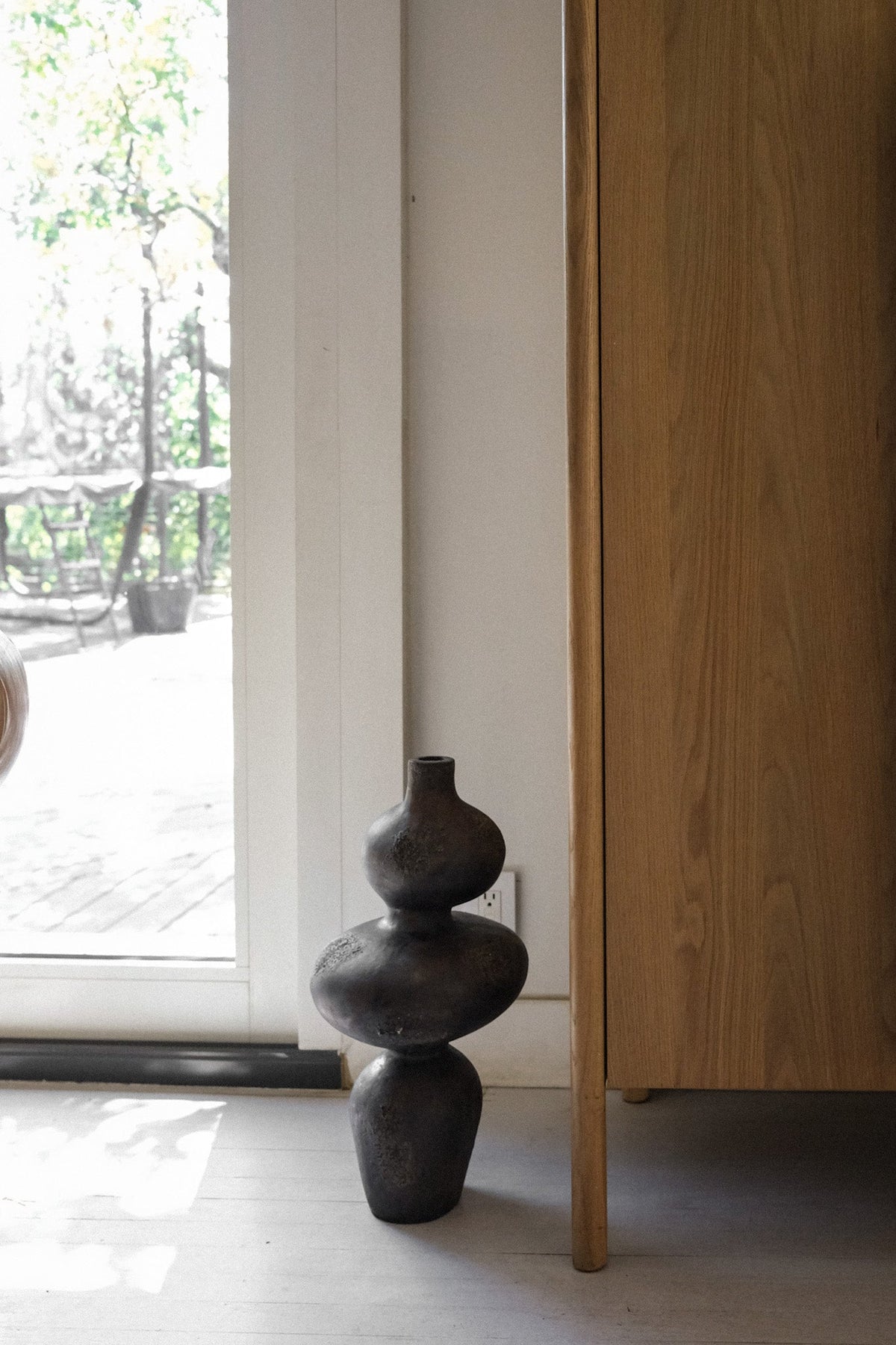 The Sewu Vessel is a captivating terracotta sculpture, handcrafted by local Indonesian artisans. This abstract piece draws inspiration from the iconic crown of the Sewu Temple, with its graceful, curvaceous layers tapering elegantly at the middle and top. Its unique shape evokes a sense of movement and balance, making it a true work of art. The vessel’s deep, earthy brown color and textured vintage finish further enhance its striking form, offering a subtle yet bold contrast in both traditional and contemporary interiors. Whether used as a decorative vase for botanicals or displayed as a standalone piece, the Sewu Vessel serves as a statement of refined artistry and cultural heritage. Make this exquisite vessel the focal point of your next home decor transformation, and let it bring an air of chic elegance to your space. Materials: Terracotta clay, highly textured brown glaze. Size dimensions: 10"D x 22"H Discover the full collection. See The Vessels E-magazine. Free Shipping within USA.  All Vessels are final sale. See here for more information.