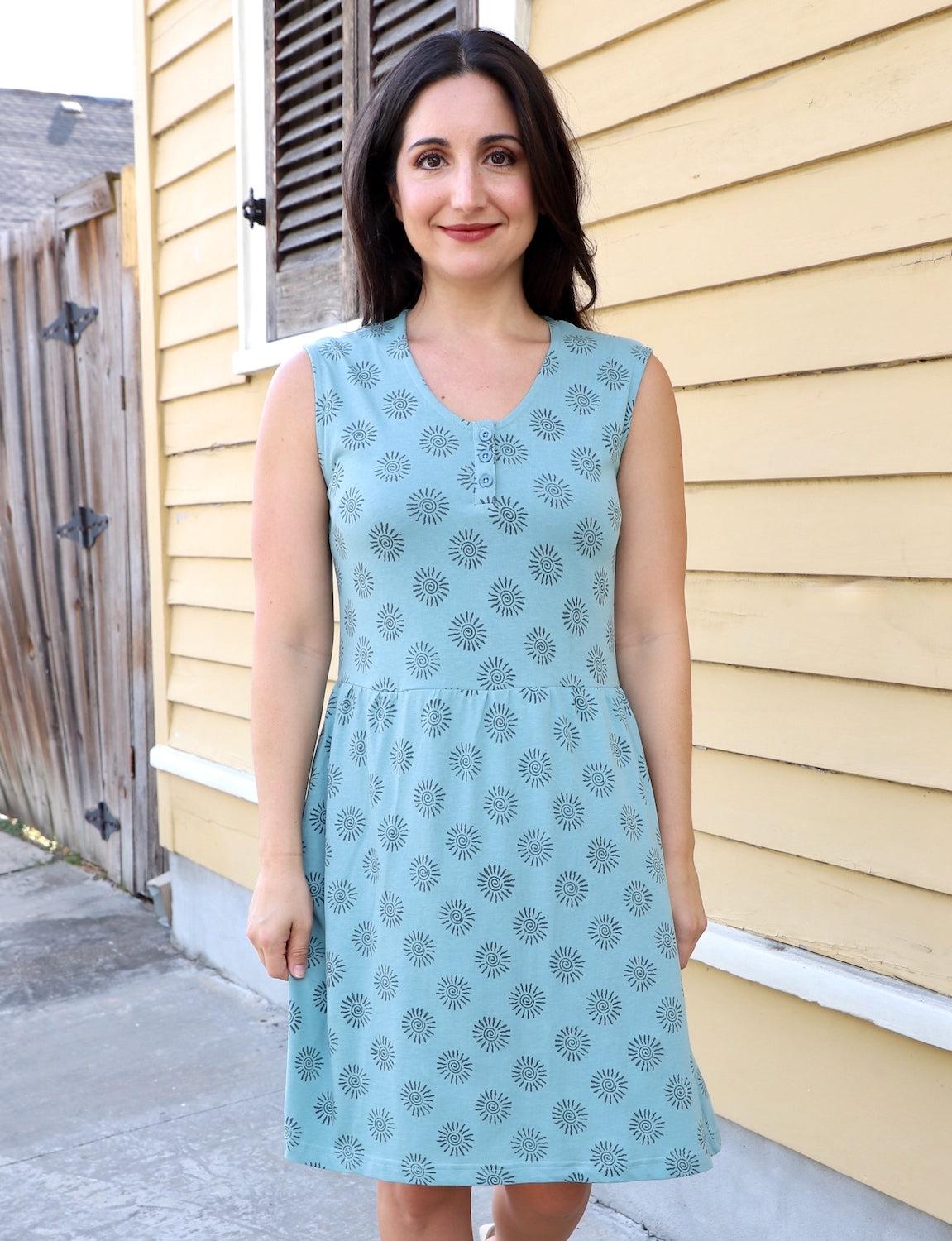 This sleeveless, sunburst organic dress features a gently pleated waist that exudes timeless charm and a breezy elegance, making it perfect for warm, sunny days. With its fresh sunburst design and sustainable fabric, you'll look and feel effortlessly stylish while supporting eco-friendly fashion choices.