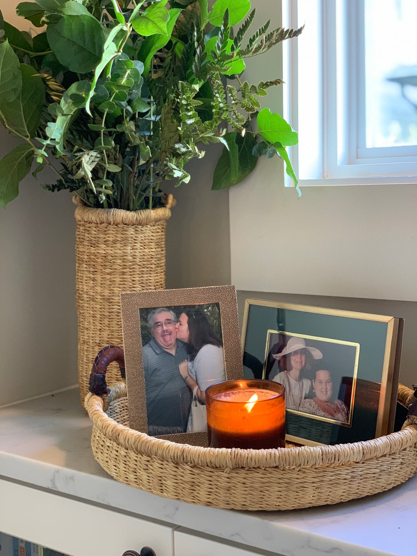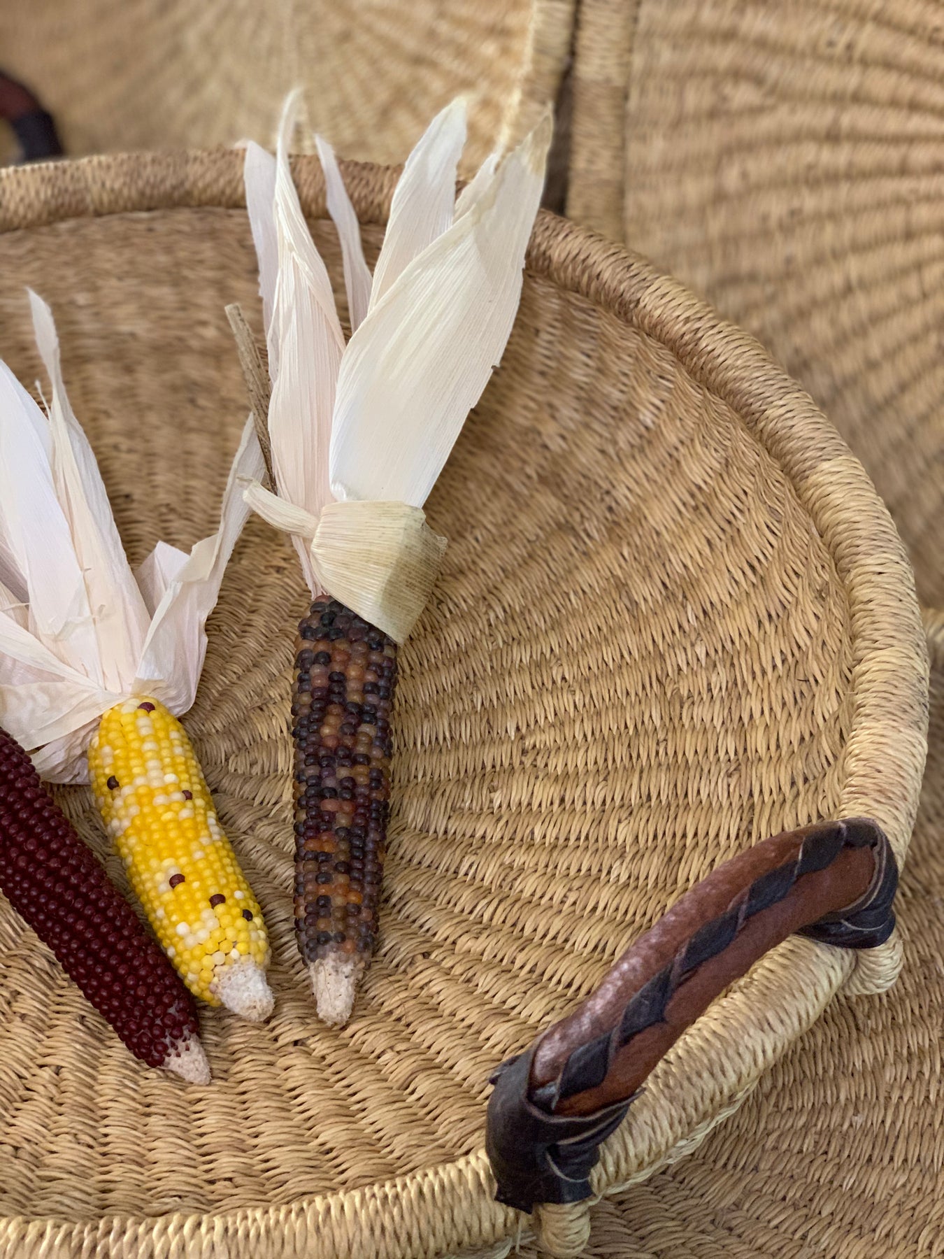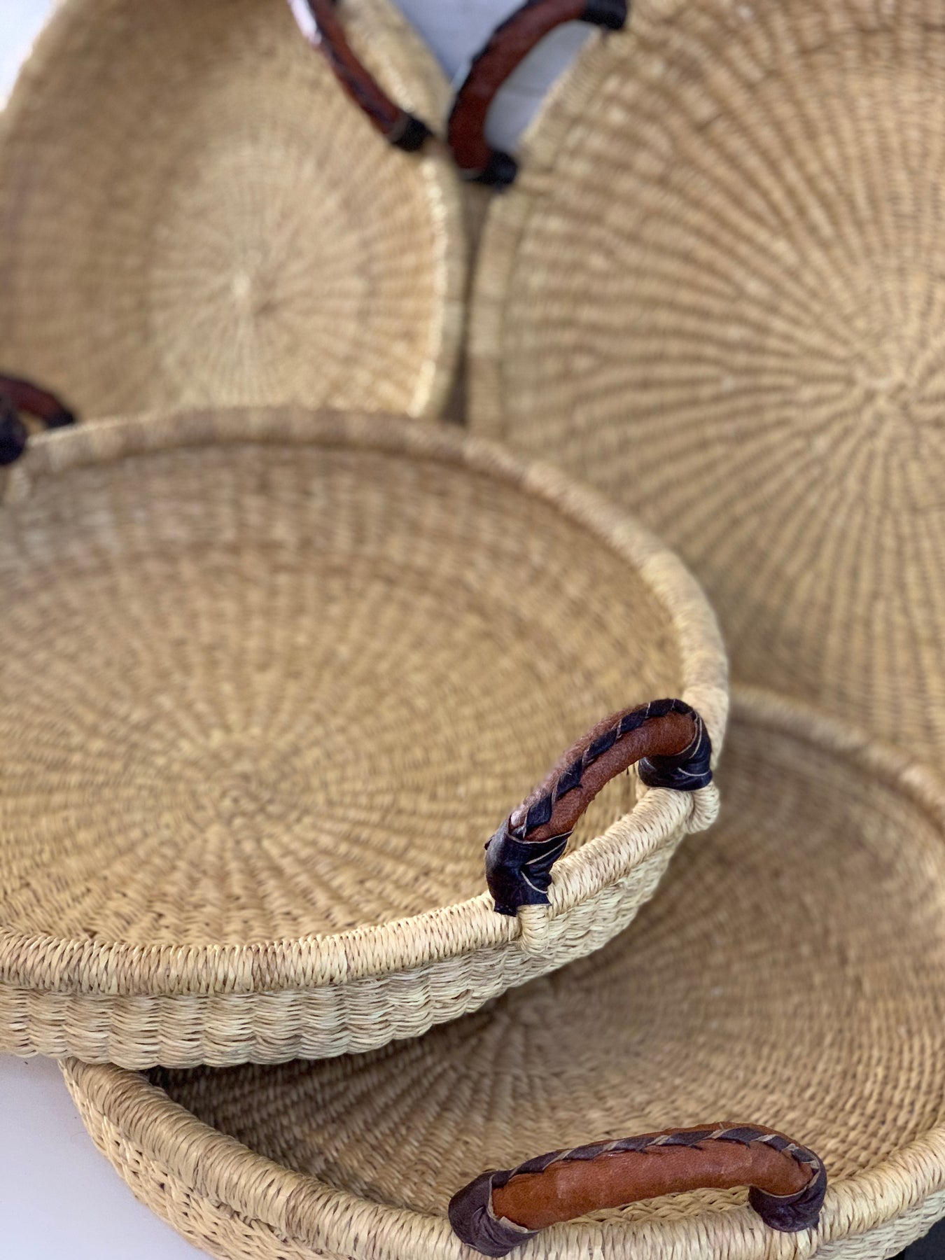 A medium/large, hand woven straw tray with leather handle great for the home and even as decor.
