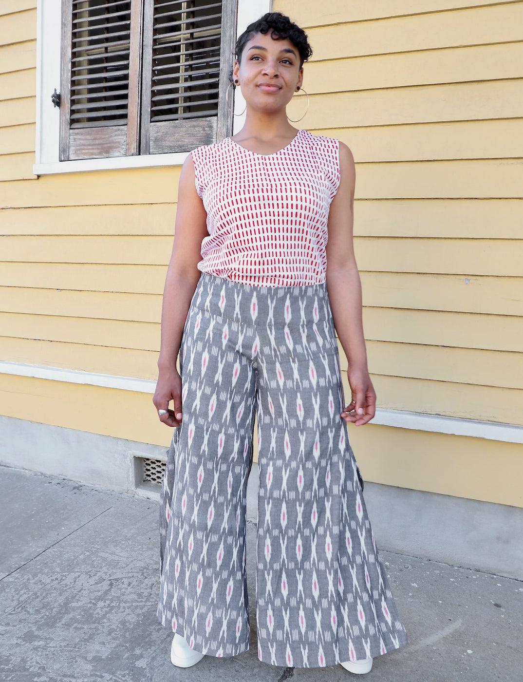 Put a little swing in your step in these bold-printed palazzo grey pants. Great for fluctuating temperatures, these chic pants are spacious enough to enjoy a nice breeze, and warm enough to stay cozy if that breeze turns chilly. Featuring a flat front waist band and elastic in the back. Available with and without a slit on the outer bottom so you can choose a flowing silhouette or tie up the legs for a funkier aesthetic. The side slit is on the outer side seam of the pants and stops at just below the knees.