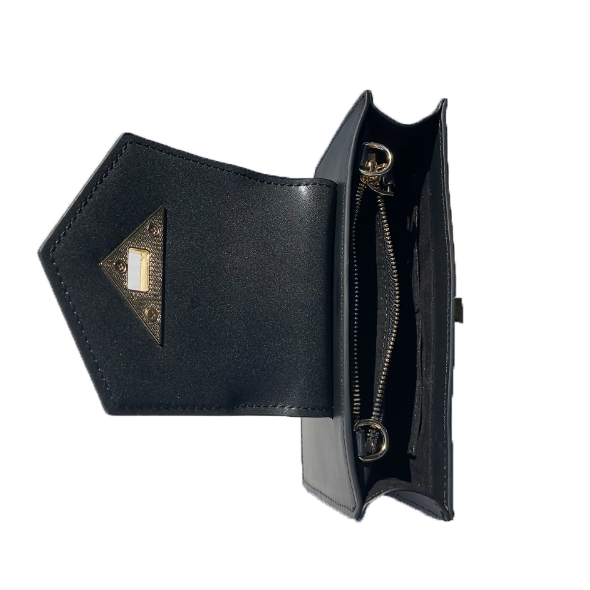 The Mary is a modern, geometric take on the classic crossbody wristlet. With a boxy structure and a sturdy, angular flap, this bag’s put together look will serve as a boost to your confidence. Composed of classic black luxury leather, you are sure to feel stylish with the Mary on hand. A twist lock is placed sleekly within a statement piece of gold accent hardware to keep the flap in place. The sharp angles throughout the design of the bag contribute to its refined look. This black small crossbody leather wristlet purse is accompanied by a luxurious gold chain as well as a wrist strap so you can wear it multiple ways. The Mary is a simultaneously a crossbody and wristlet that is perfect for keeping all your essentials organized with one zipper pocket and 6 credit card slots. Its spacious interior fits even the largest smartphone models.