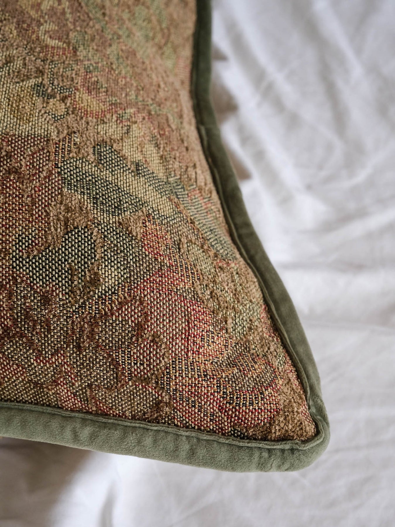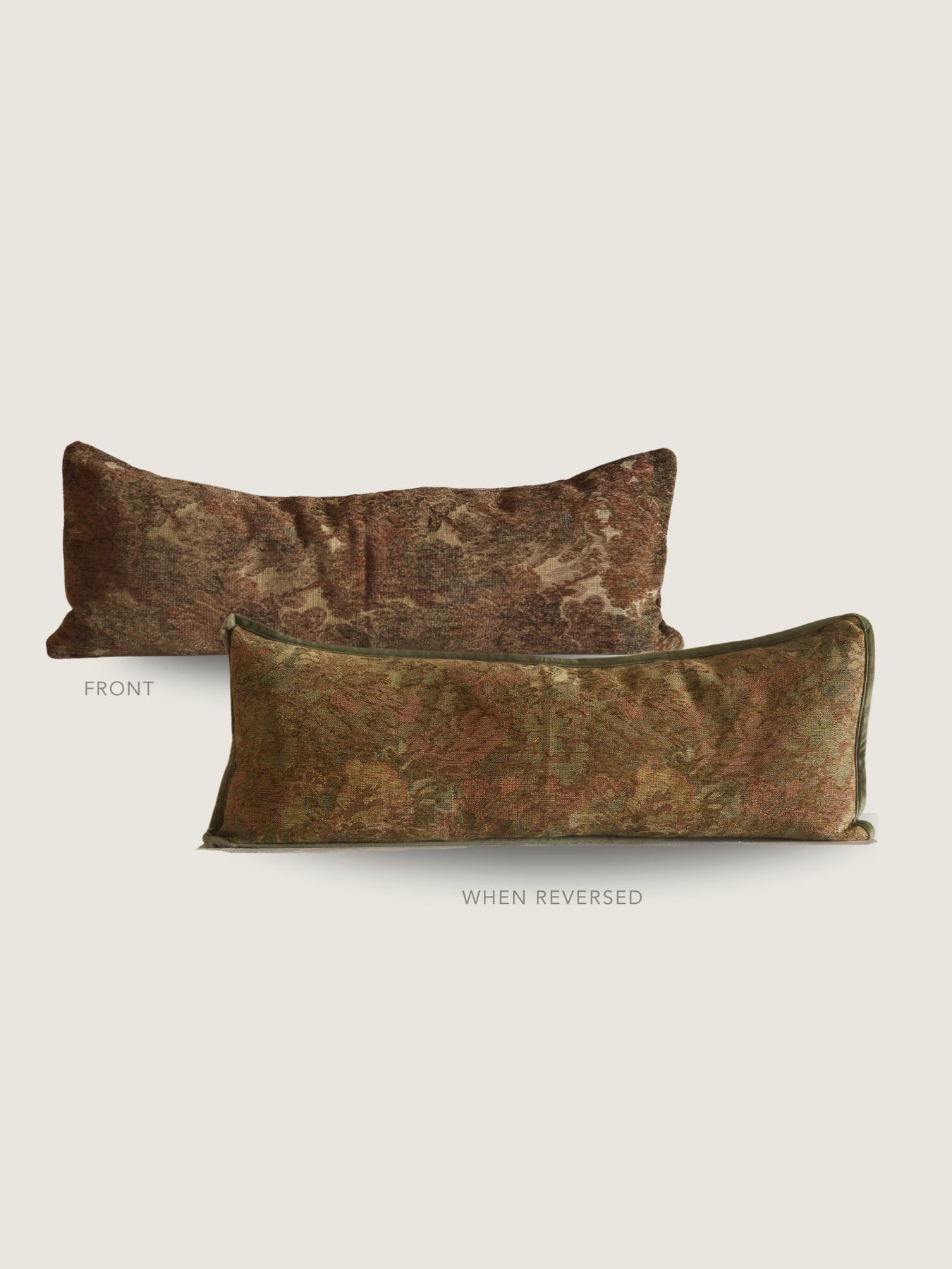 Sylvie is a masterpiece of Renaissance-inspired elegance. This jacquard pillow features a cream base with shades of muted red and green patterns on the front. When reversed, it showcases a brown base with shades of muted red and green patterns and a green velvet edge on the reverse. Adorned with intricate floral and leaf patterns reminiscent of the lush botanical motifs found in Renaissance paintings, Sylvie is finished with a sumptuous velvet trim, adding a touch of luxurious texture. Its reversible design offers versatility, presenting another captivating pattern to suit your mood and style. This pillow invites you to transform your home into a gallery of refined elegance.